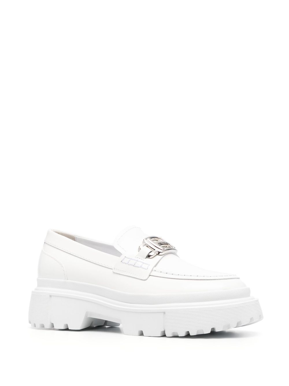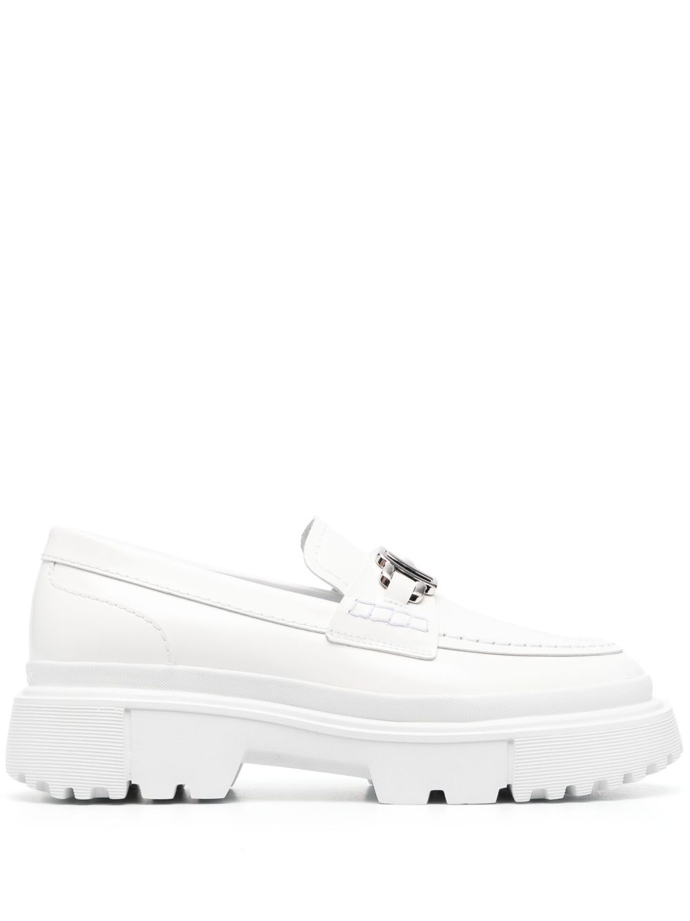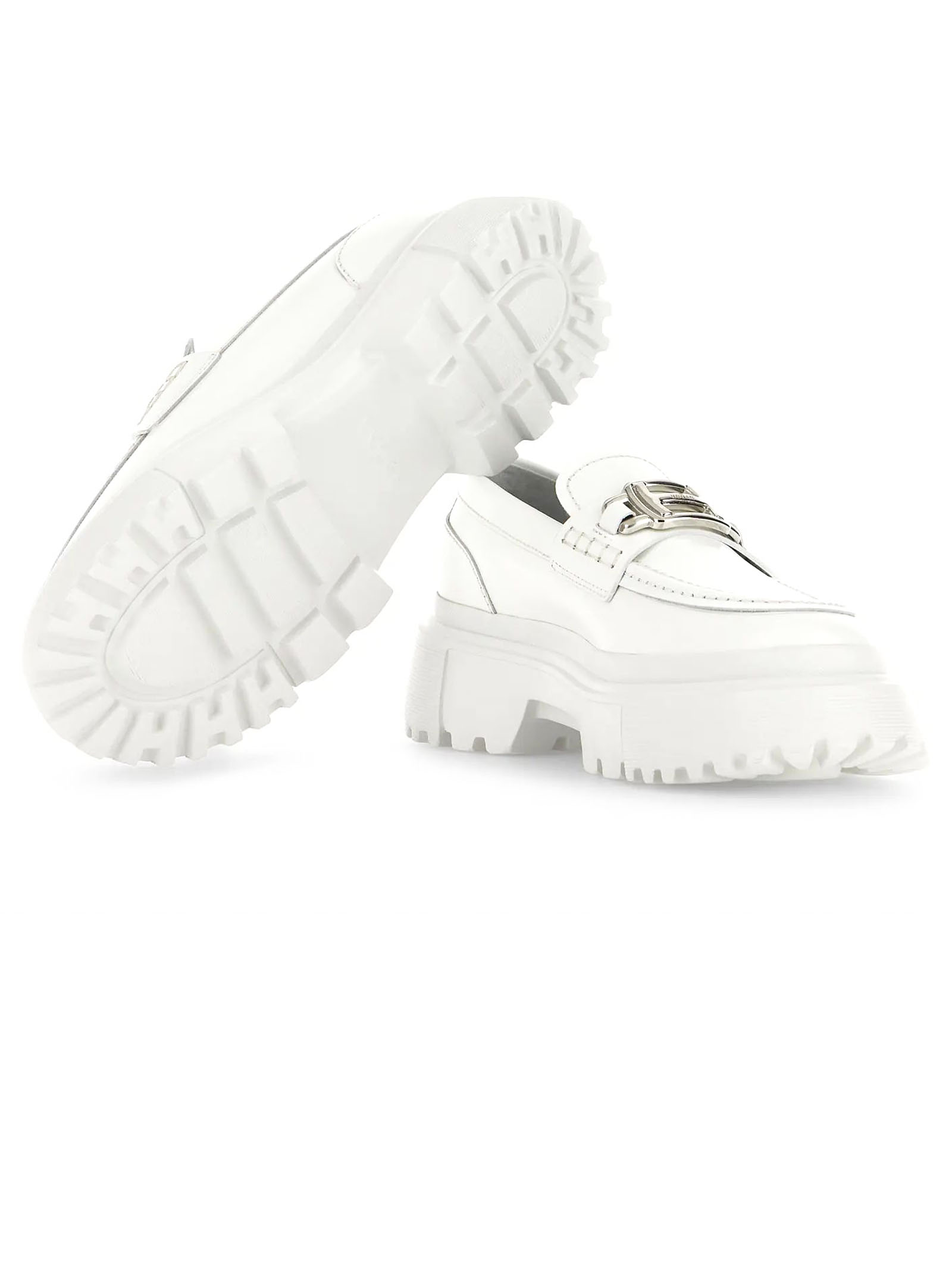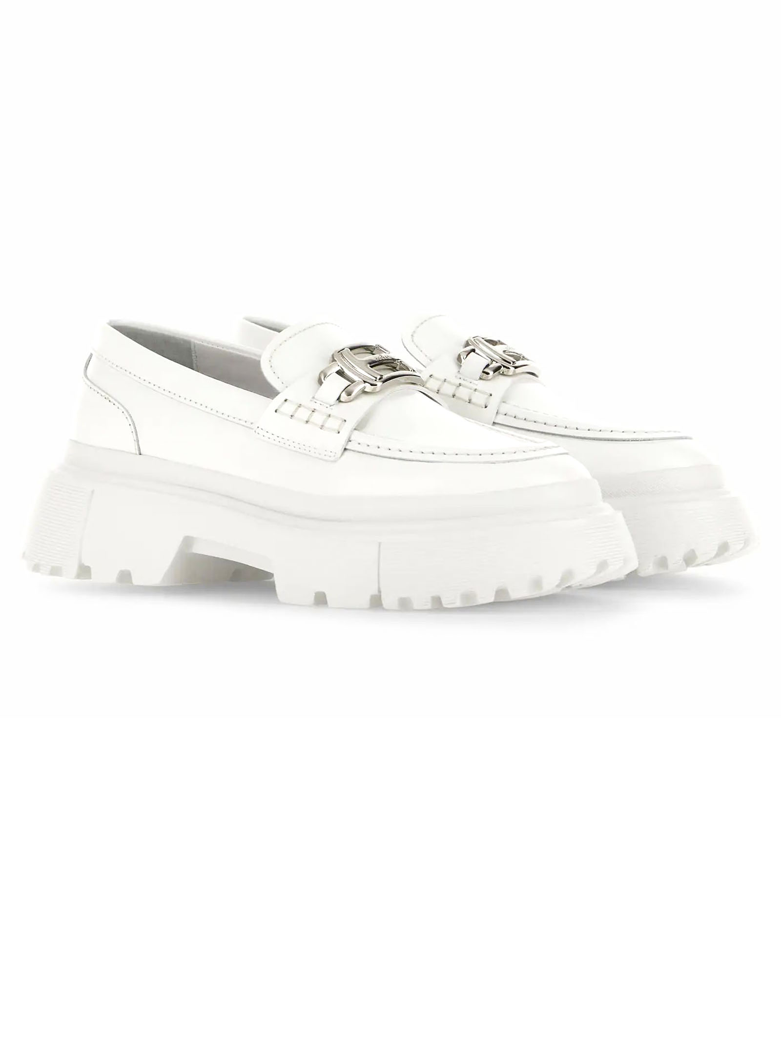 Mocassino H629 bianco, tomaia in pelle abrasivata, mascherina, accessorio H in metallo personalizzato, impunture a vista, Fussbett in memory foam 5 mm, suola in EVA, altezza totale 5 cm