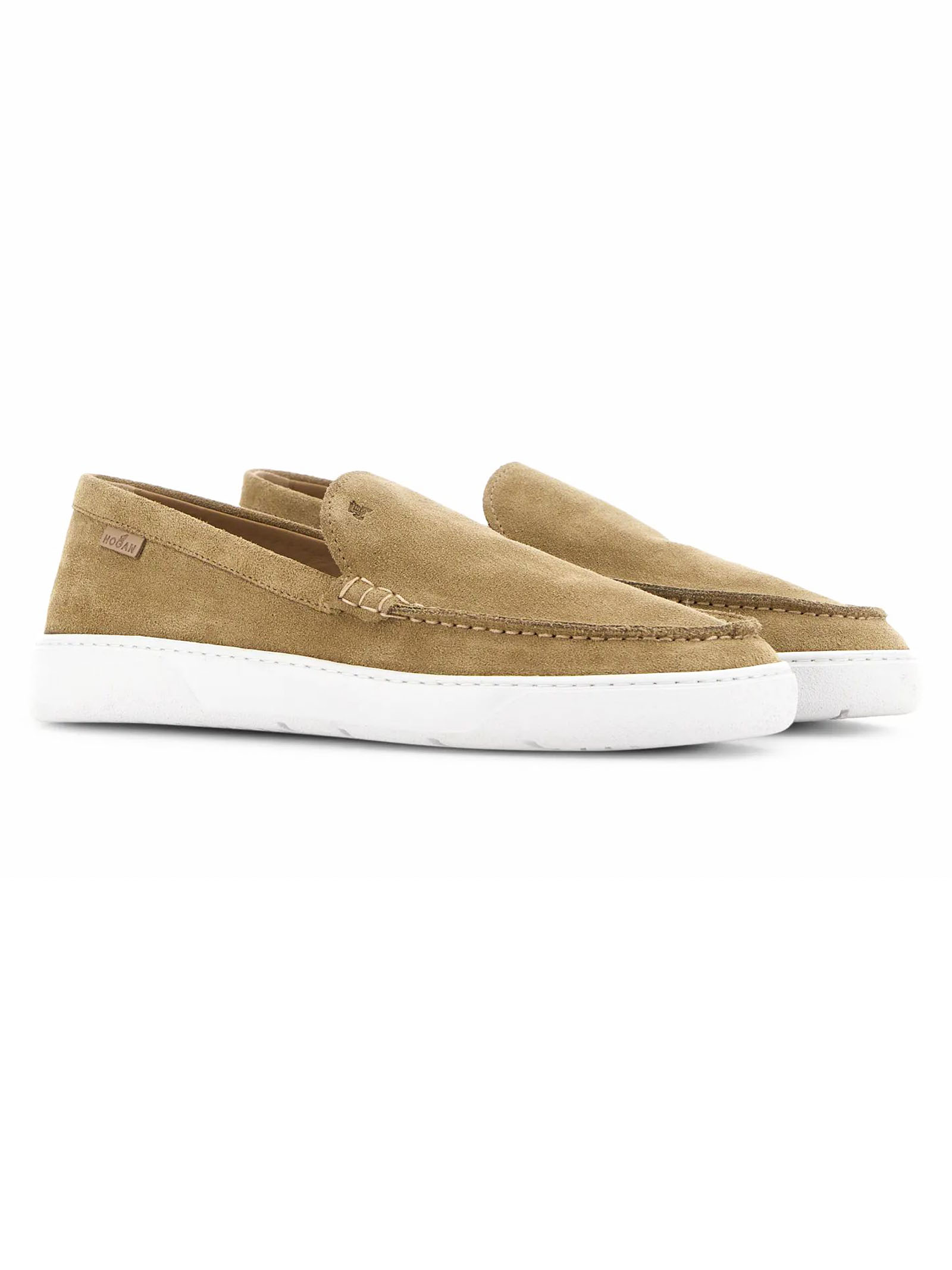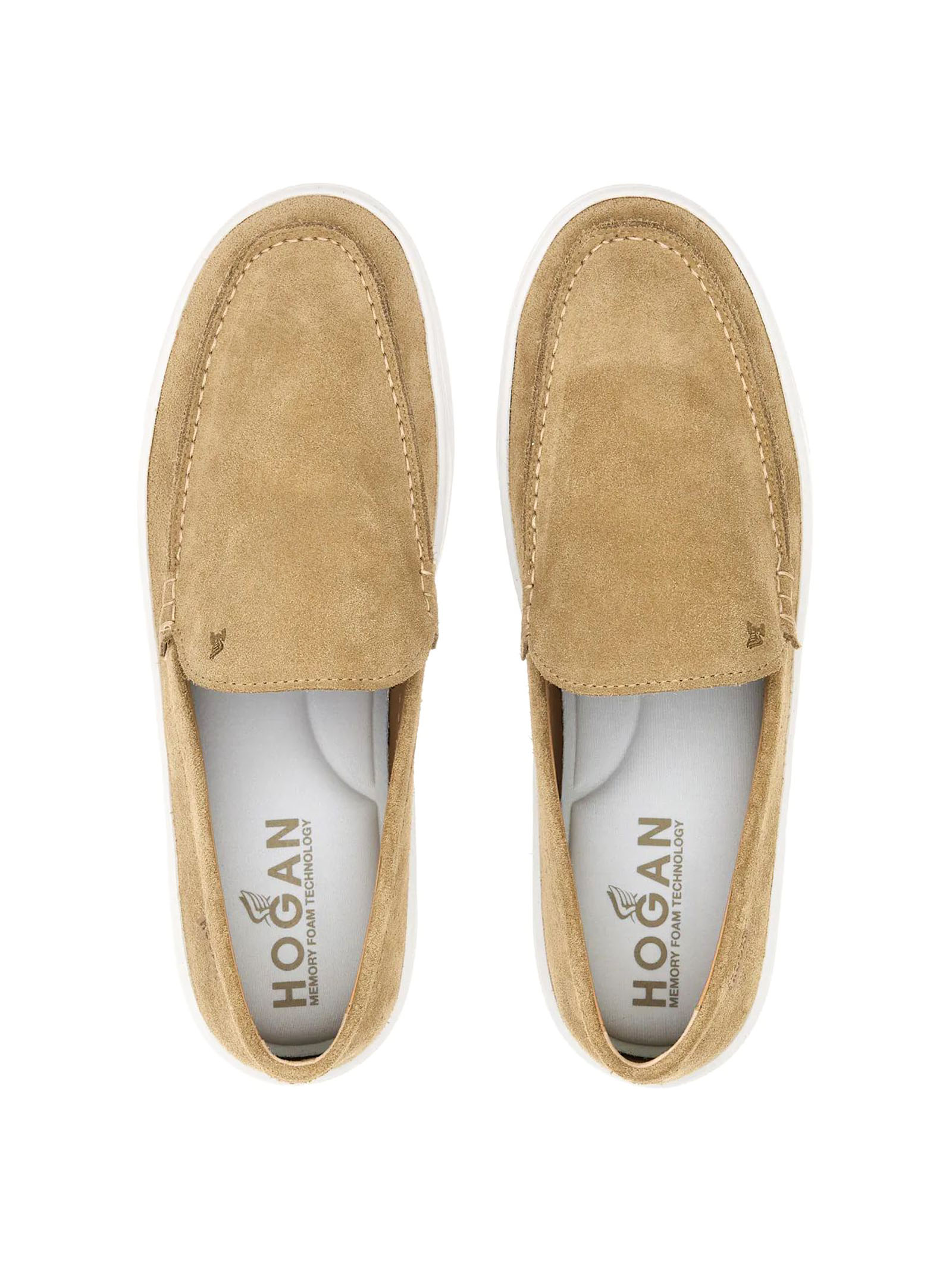 Mocassino in pelle scamosciata marrone, monogramma Hogan impresso, impunture realizzate a mano, fussbett in memory foam rivestito, suola in gomma