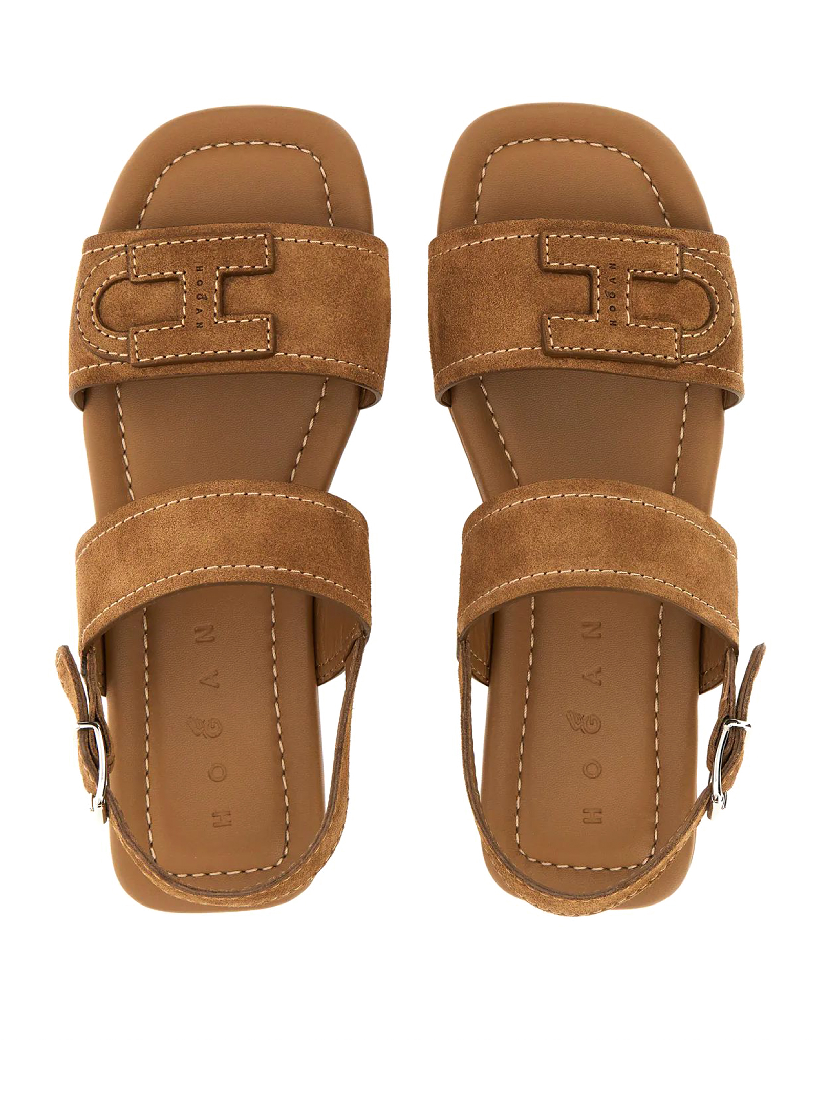 Sandali Flat Hogan H685 Marrone, Tomaia in pelle scamosciata, H applicata con logo Hogan impresso, Cinturino regolabile al tallone, Soletta morbida rivestita in pelle, Suola in gomma, Altezza totale 2 cm