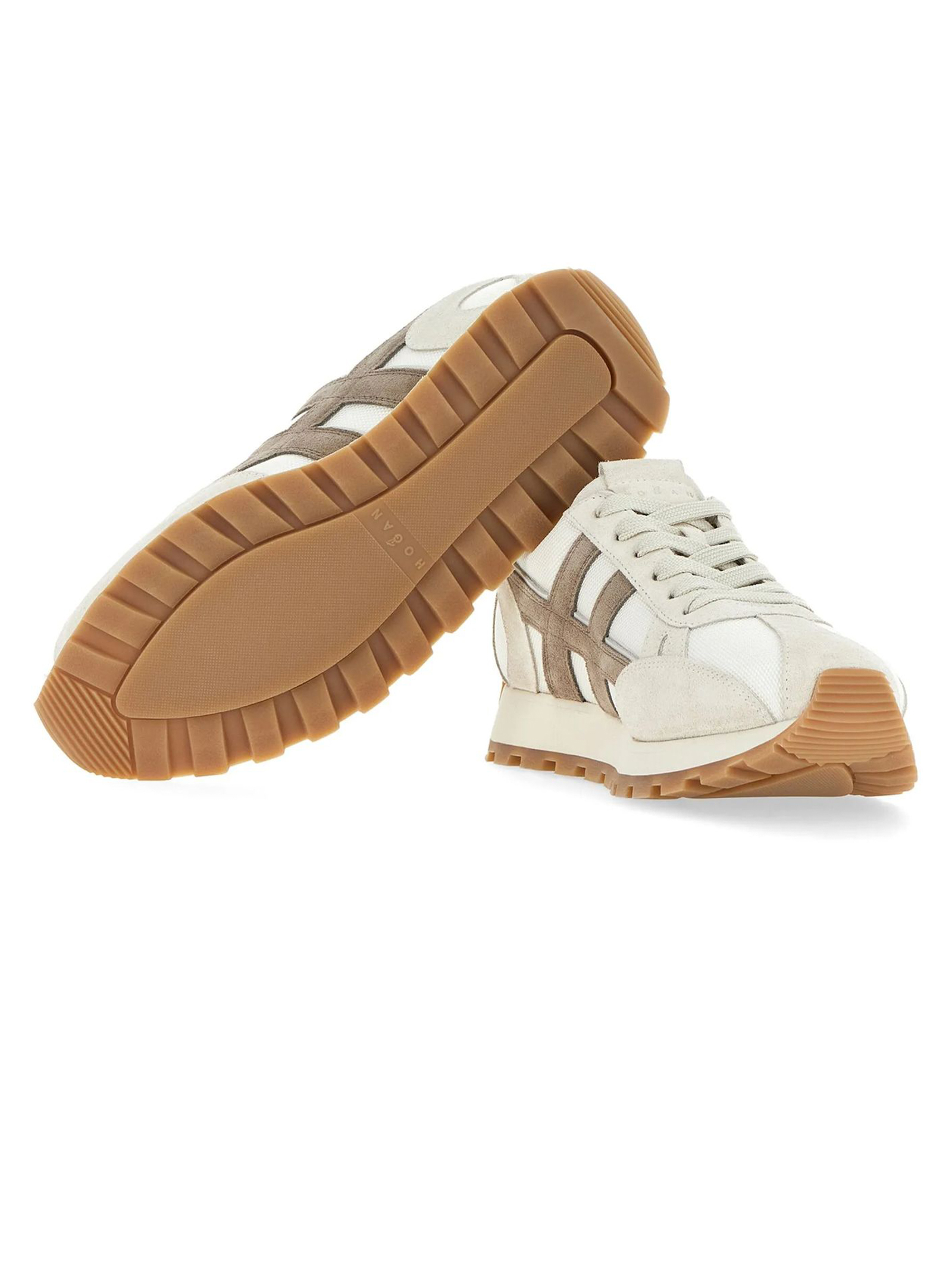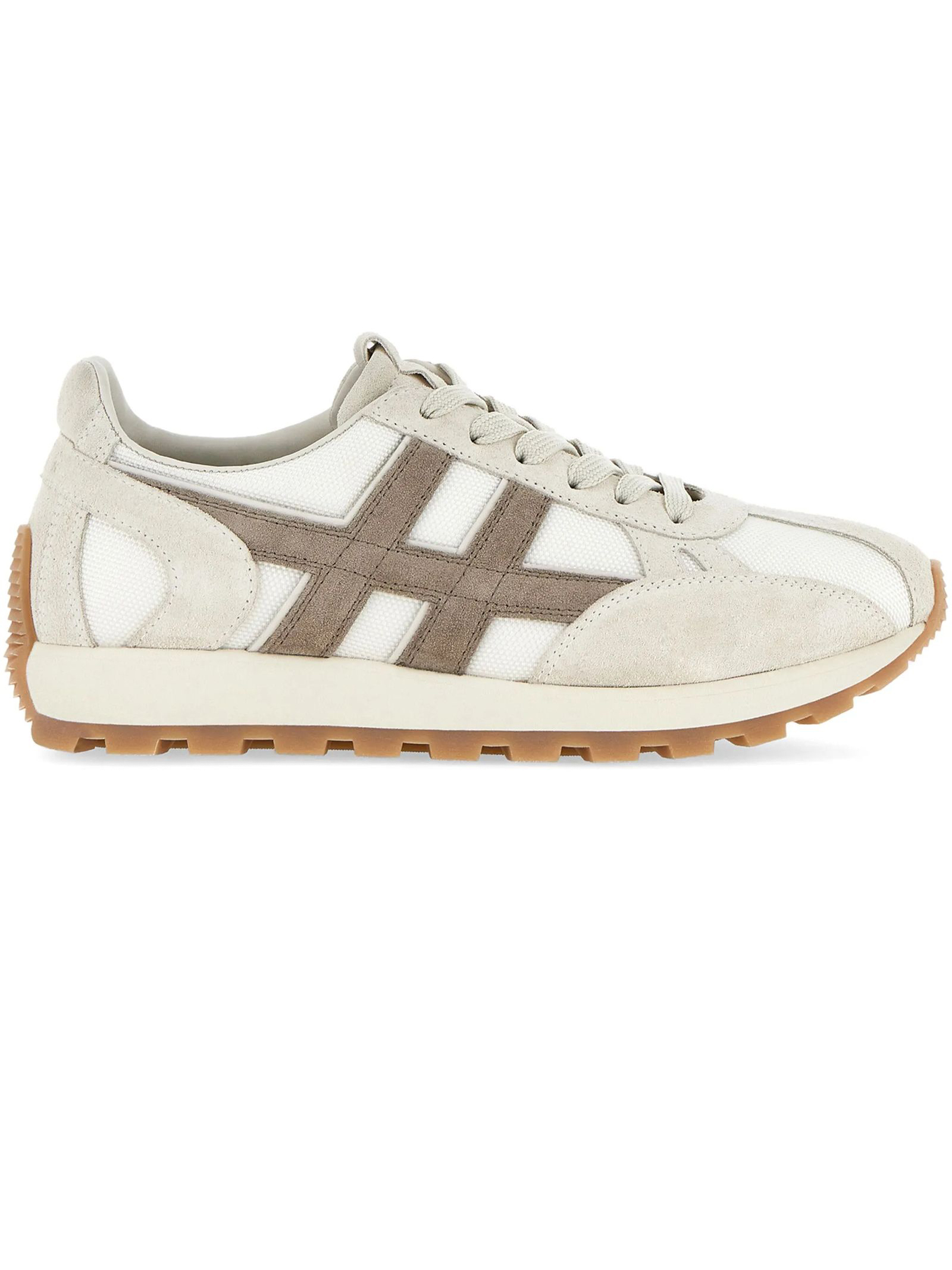 Sneakers Hogan 86er Avorio Bianco Marrone, Inserti in tessuto tecnico, H scamosciata applicata sul lato, Soletta morbida rivestita in pelle 4,5 mm, Suola in EVA, Altezza totale 4 cm