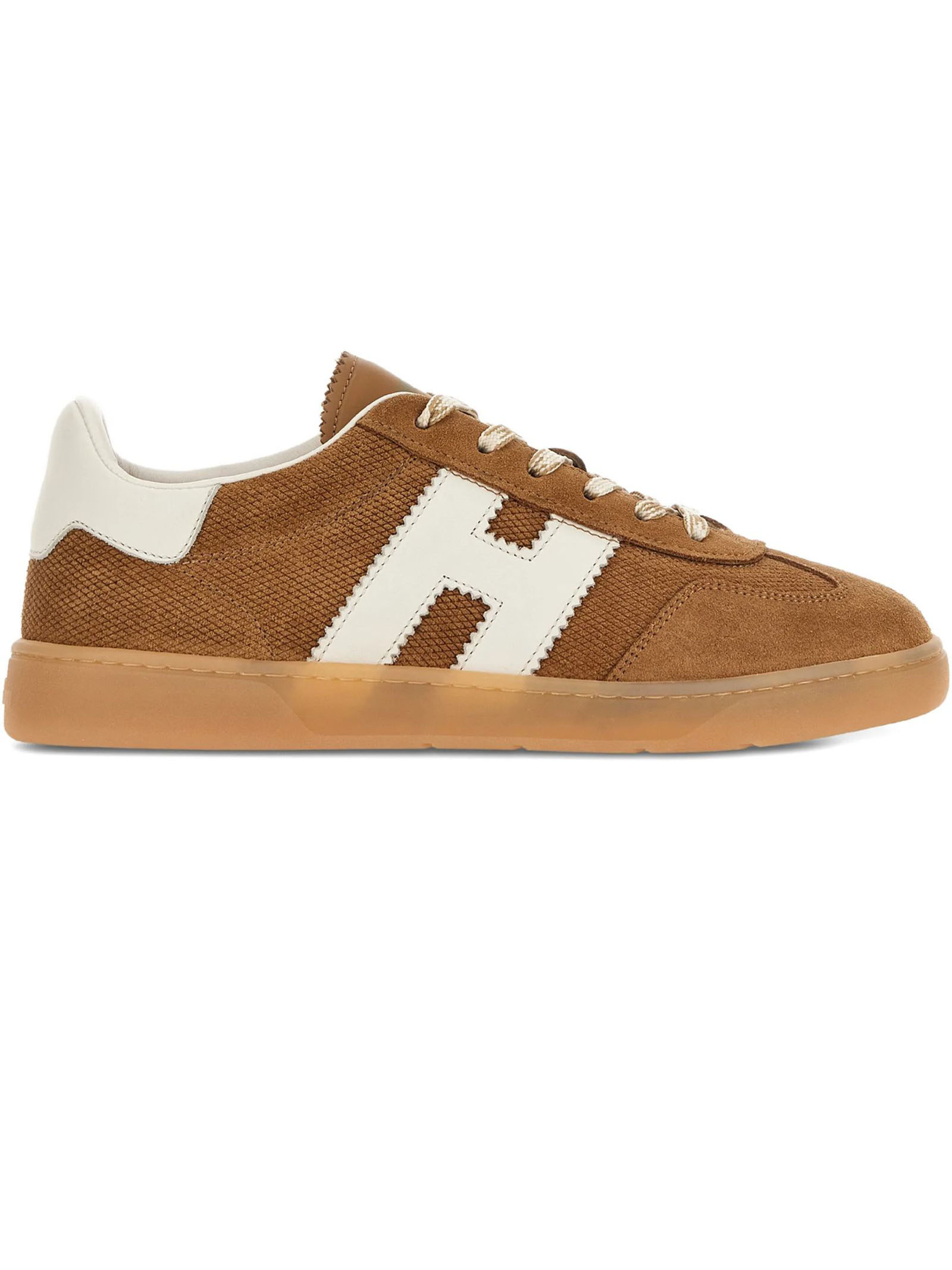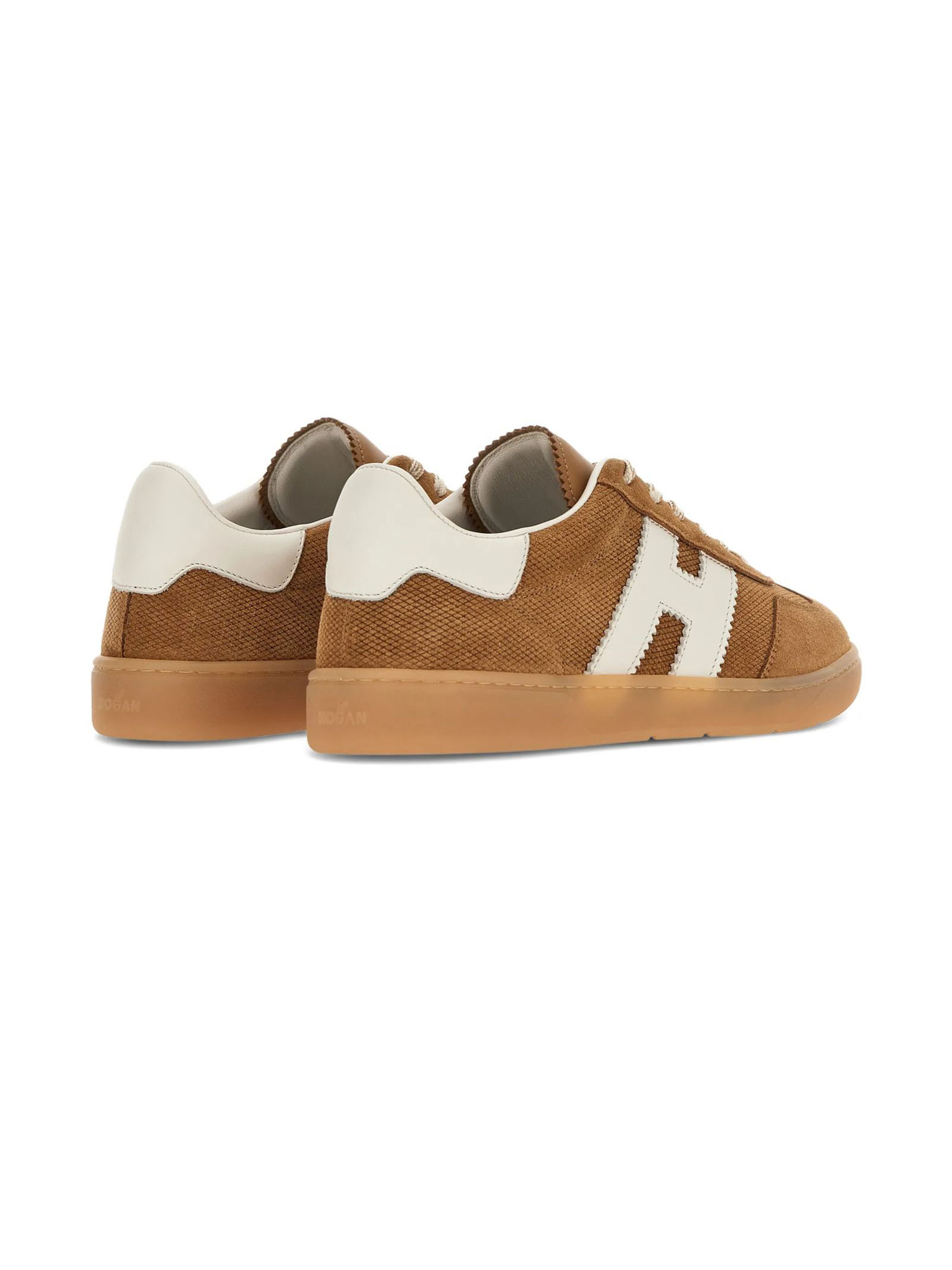 Sneakers Hogan Cool Marrone, Tomaia in pelle scamosciata, H laterale dentellata e dettagli in pelle liscia, Soletta in memory foam 8 mm, Suola a cassetta in gomma (TPU), Altezza totale 3,2 cm