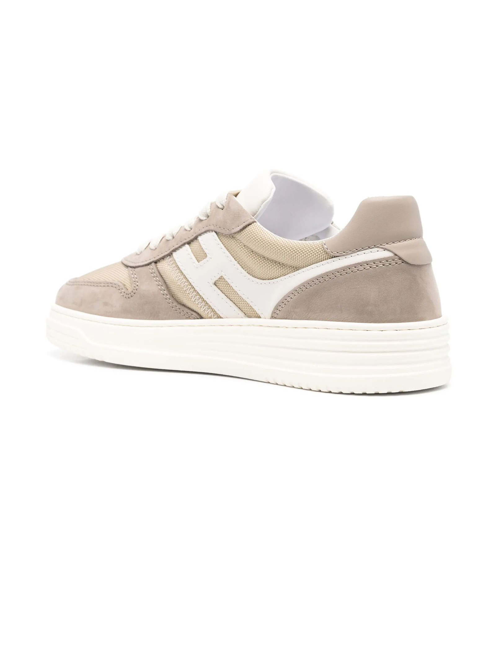 Sneakers Hogan H630 Beige, Tomaia in nabuk, Inserti in tessuto tecnico e pelle liscia, Dettagli in nappa, H laterale, Soletta in memory foam 9 mm, Suola in gomma, Altezza totale 3,8 cm