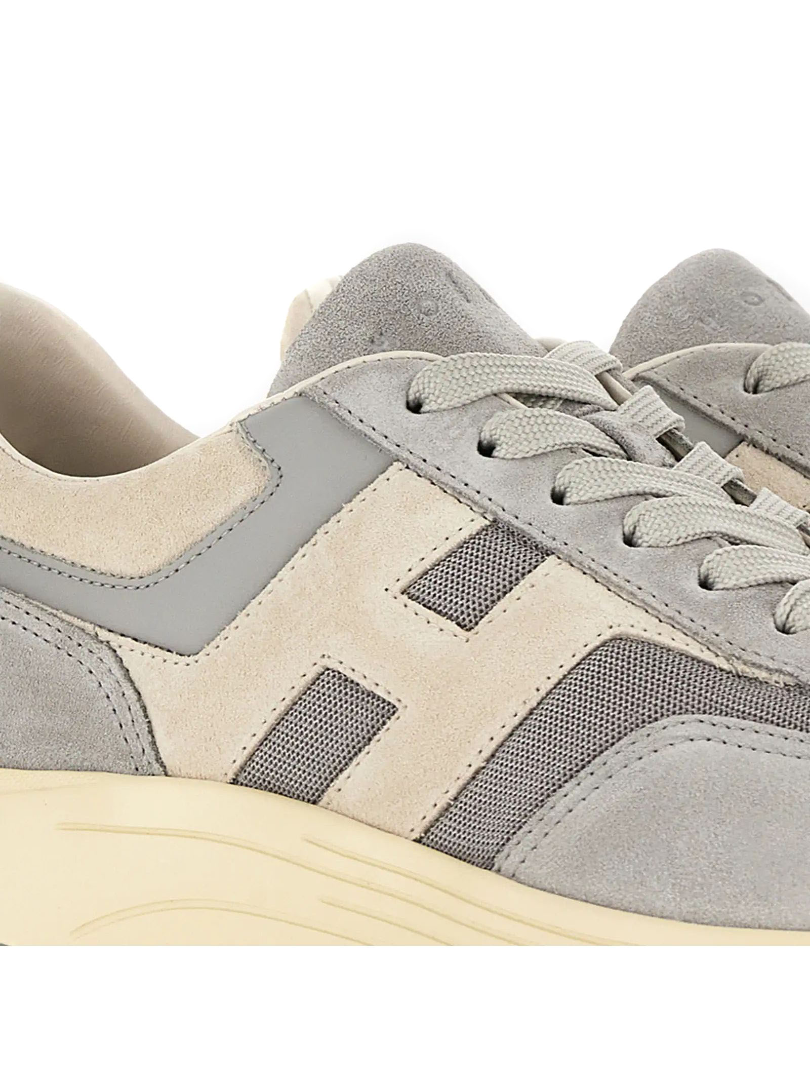Sneakers Hogan Hyperlight Azzurro Grigio, Tomaia in pelle scamosciata e tessuto, Dettagli in pelle liscia, H laterale inclinata, Soletta in memory foam 8 mm, Suola in gomma, Altezza totale 4,5 cm