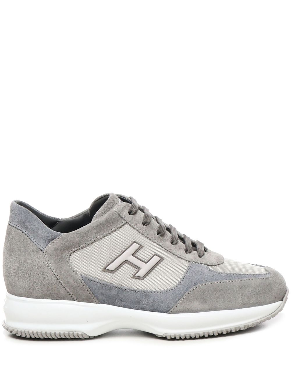 Sneakers Hogan Interactive Grigio, Tomaia in pelle scamosciata, Inserti in tessuto tramato, H laterale in floccato, Impunture a vista, Soletta removibile 12 mm, Suola in gomma, Altezza totale 5,7 cm