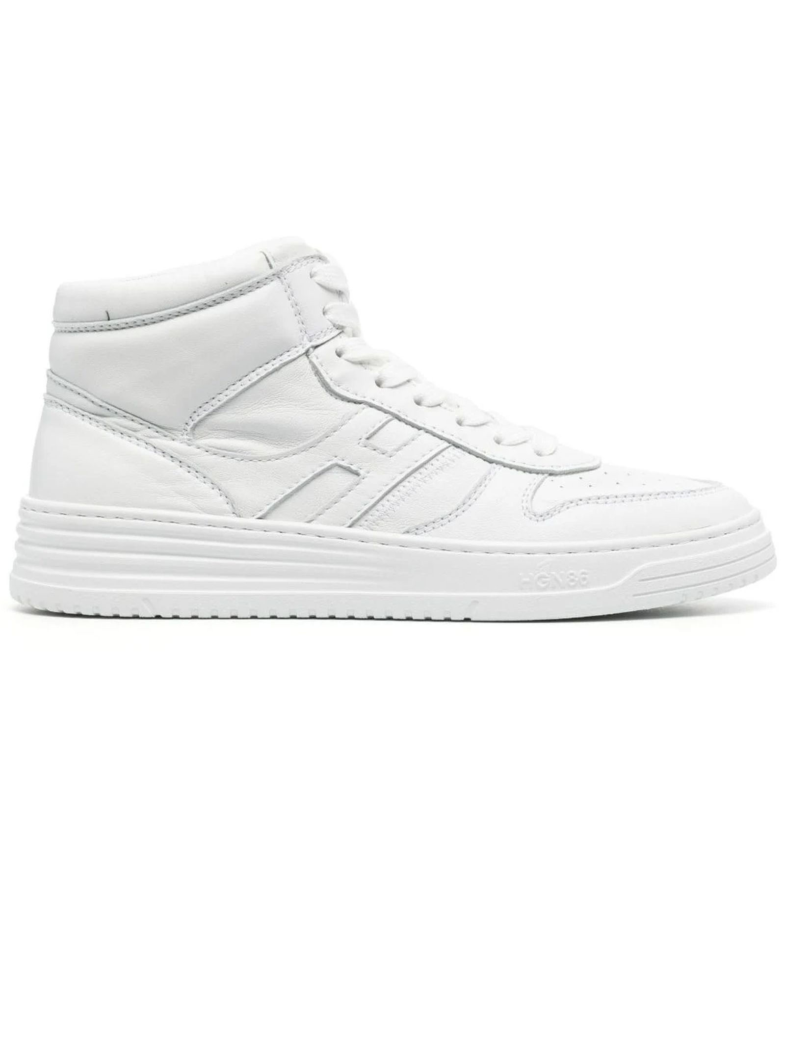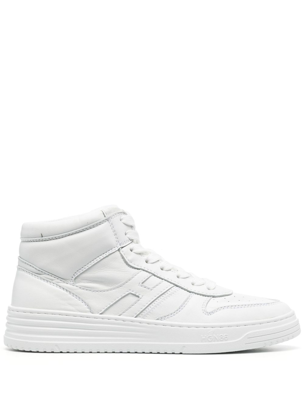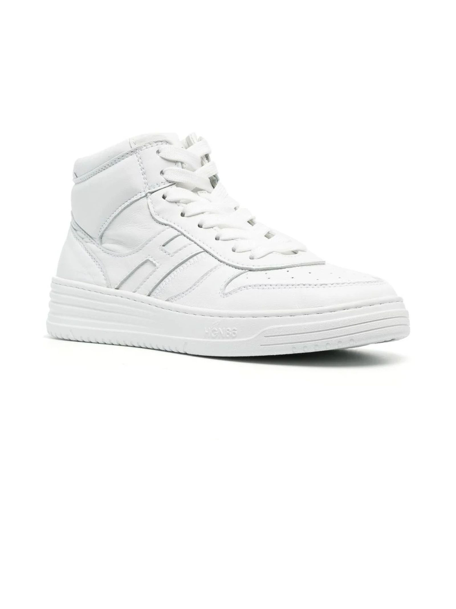 sneakers in pelle biancopelle di vitellodettaglio della toppasottopiede in pelle logatopunta rotondachiusura frontale con laccisuola piatta in gomma