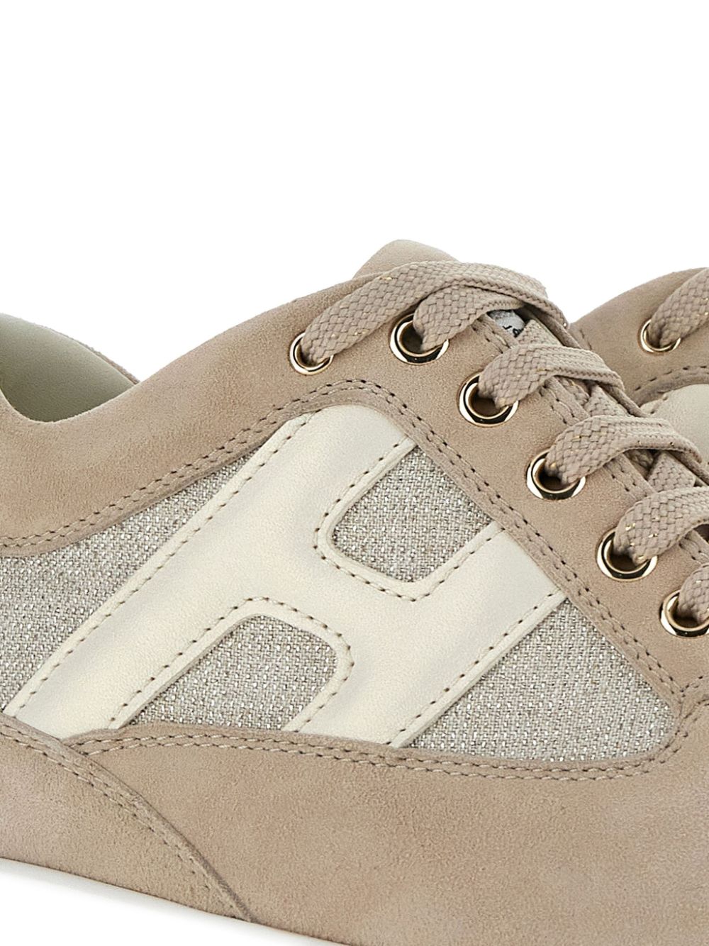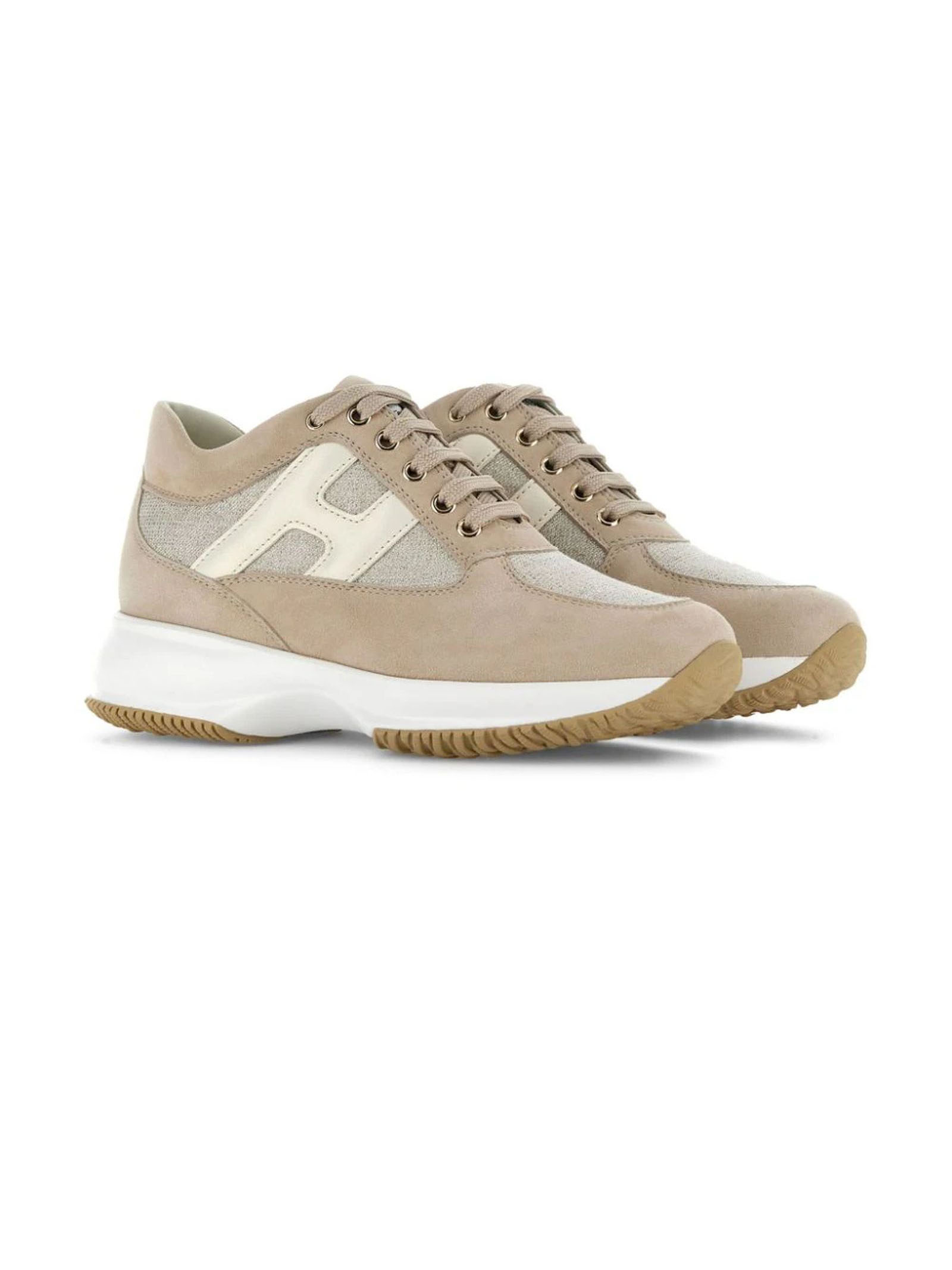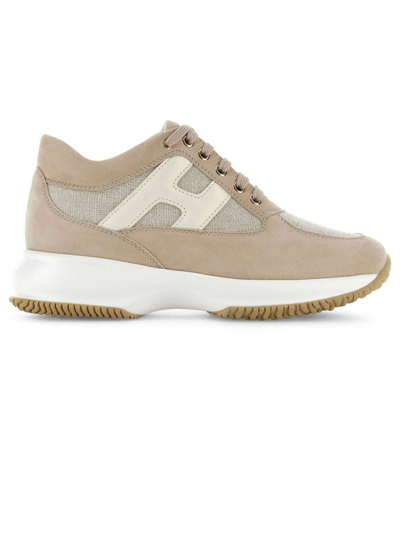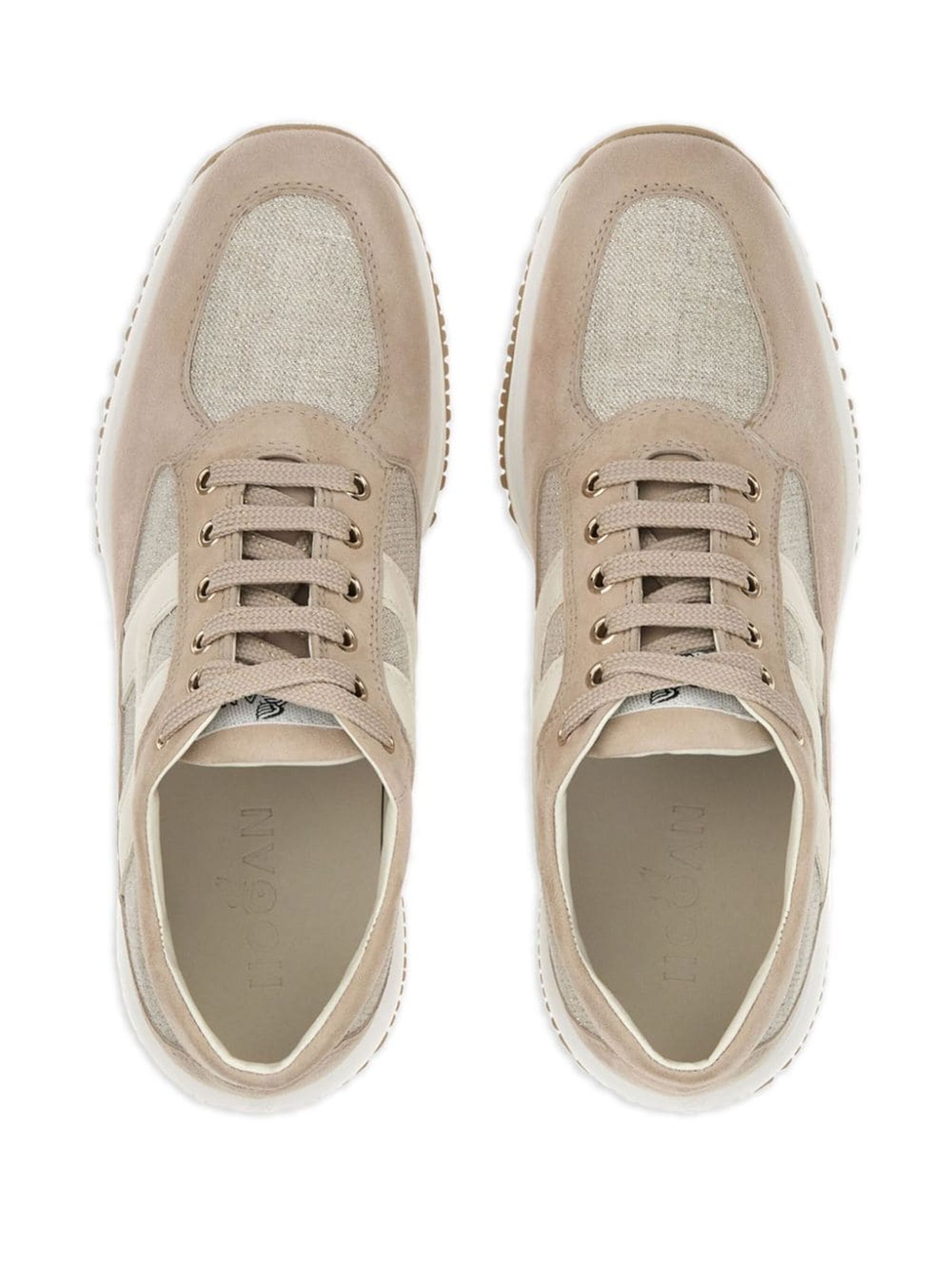sneakers interactive beigepelle di vitellograna lisciapunta a mandorladettaglio logo traforatochiusura frontale con laccisottopiede in pelle logatosuola spessa in gomma