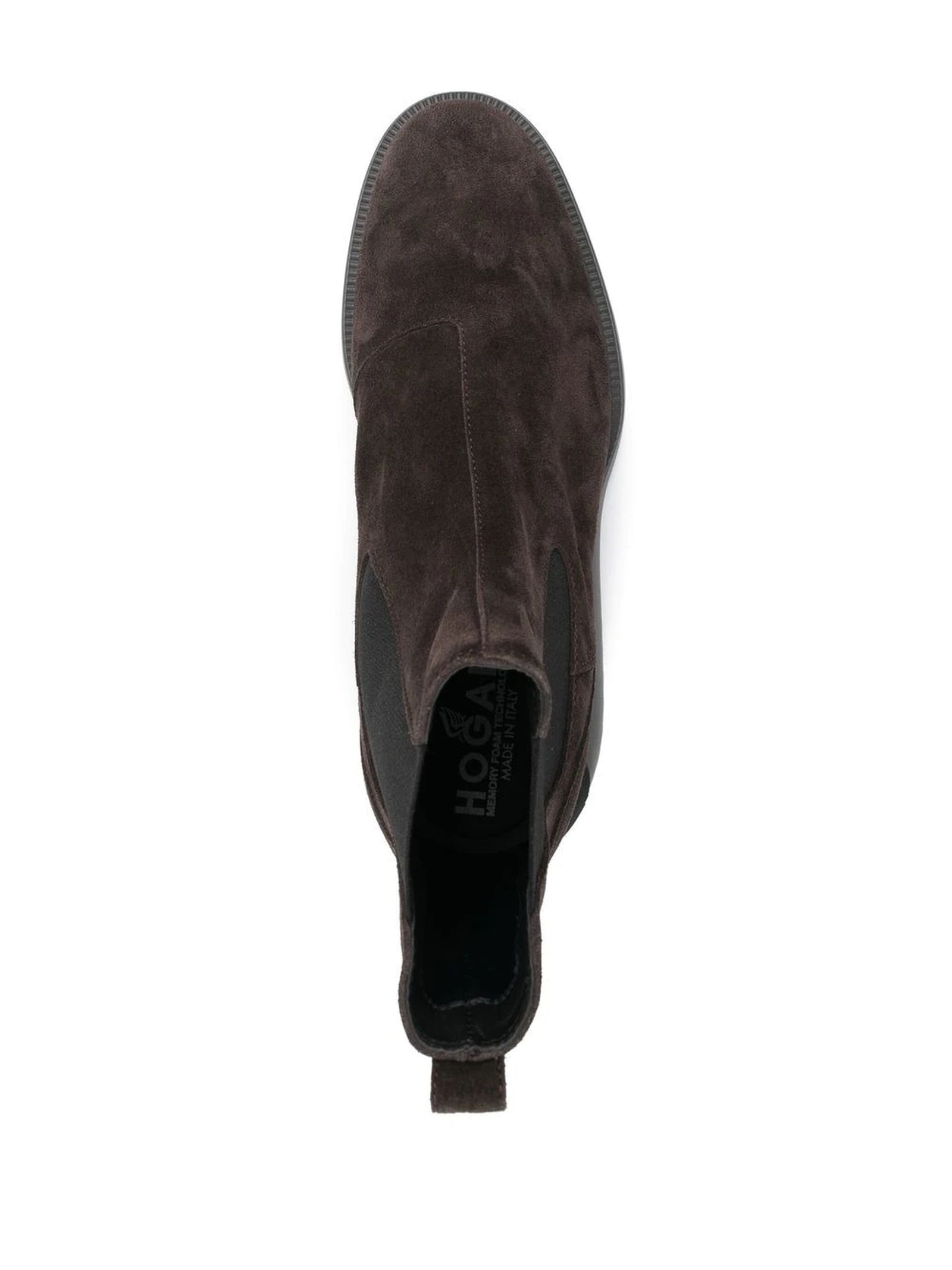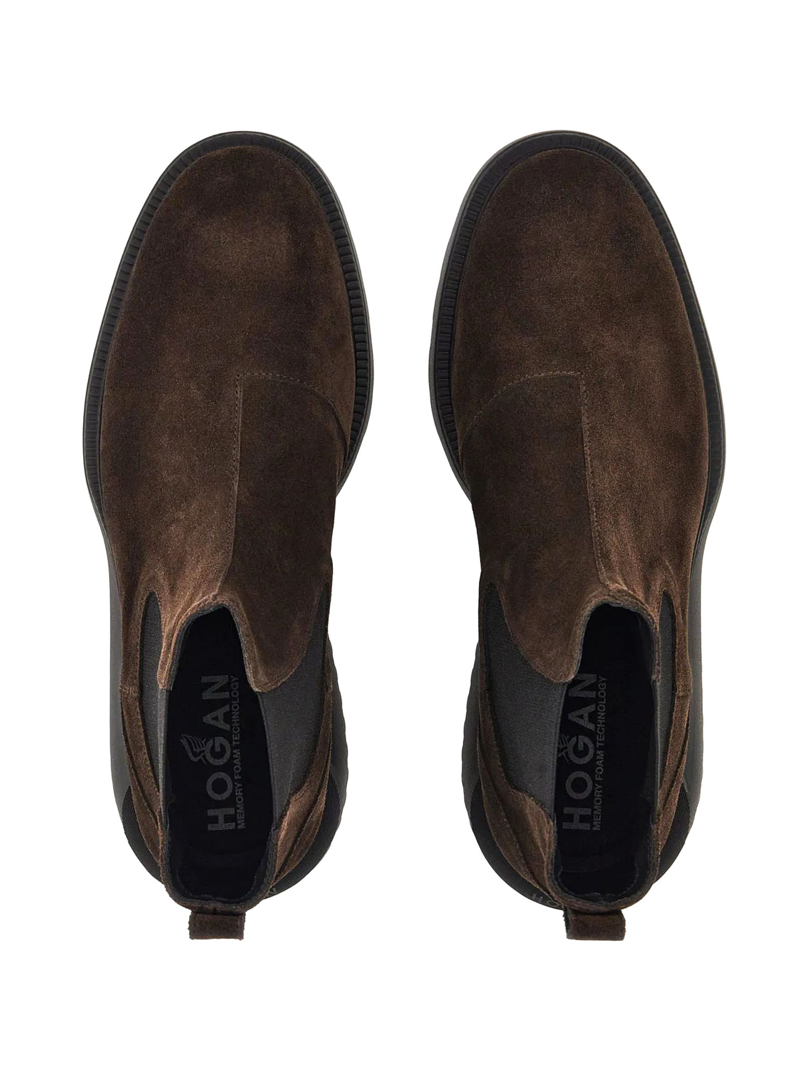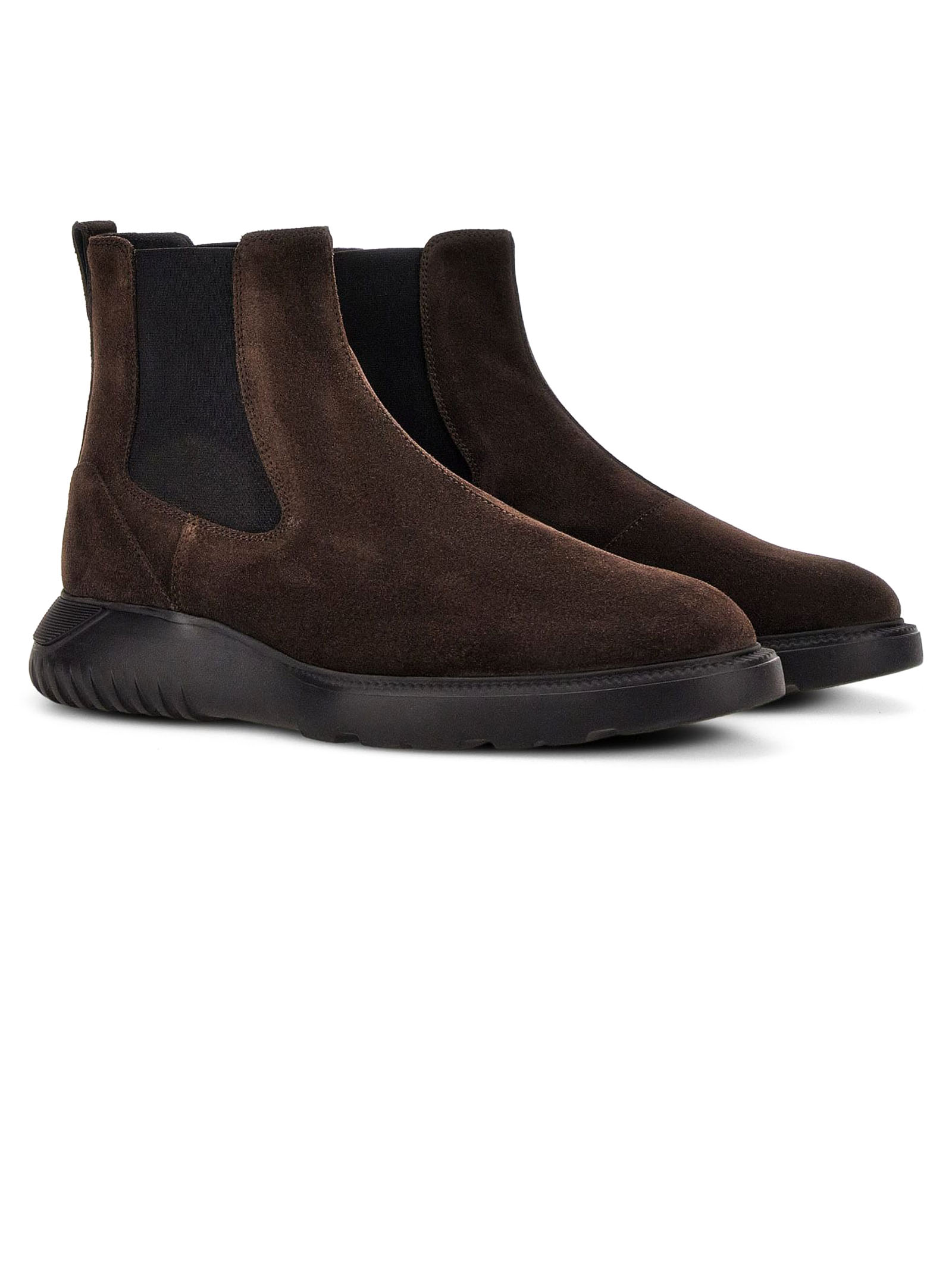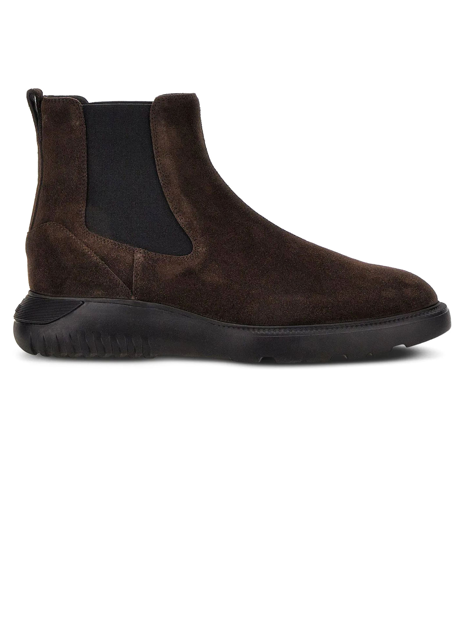 stivaletto in pelle marronepannelli laterali elasticizzatipunta rotondasoletta con marchiosuola piatta in gommapelle scamosciatalunghezza alla caviglia