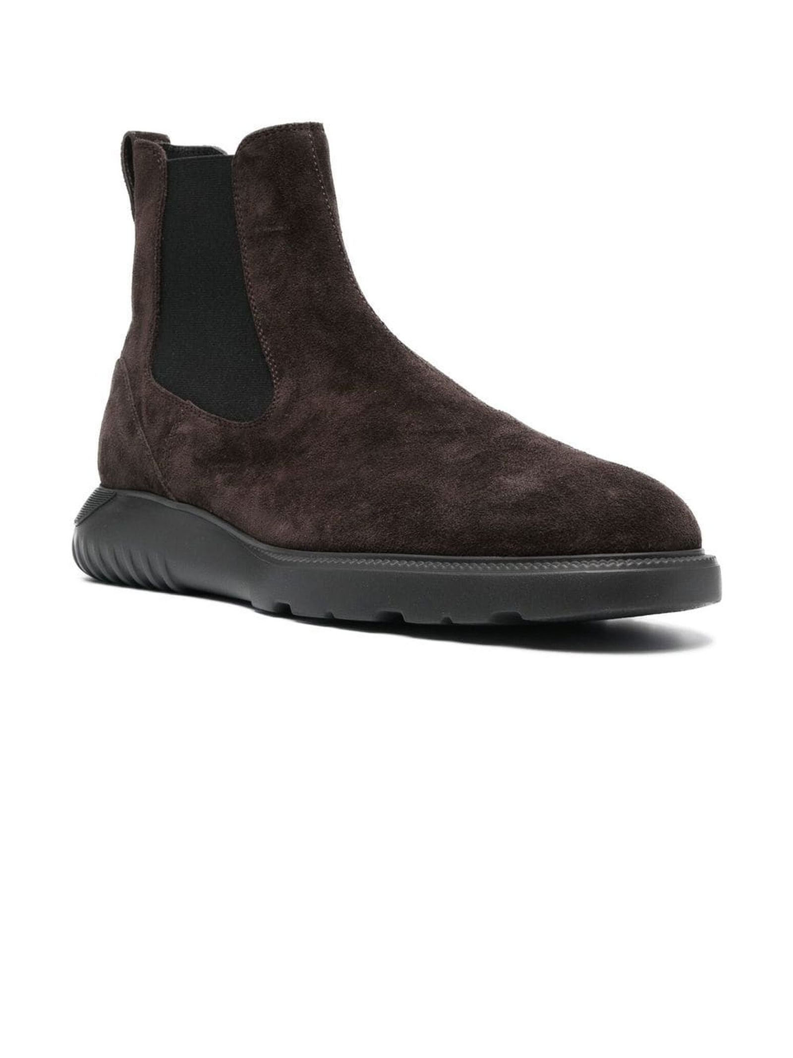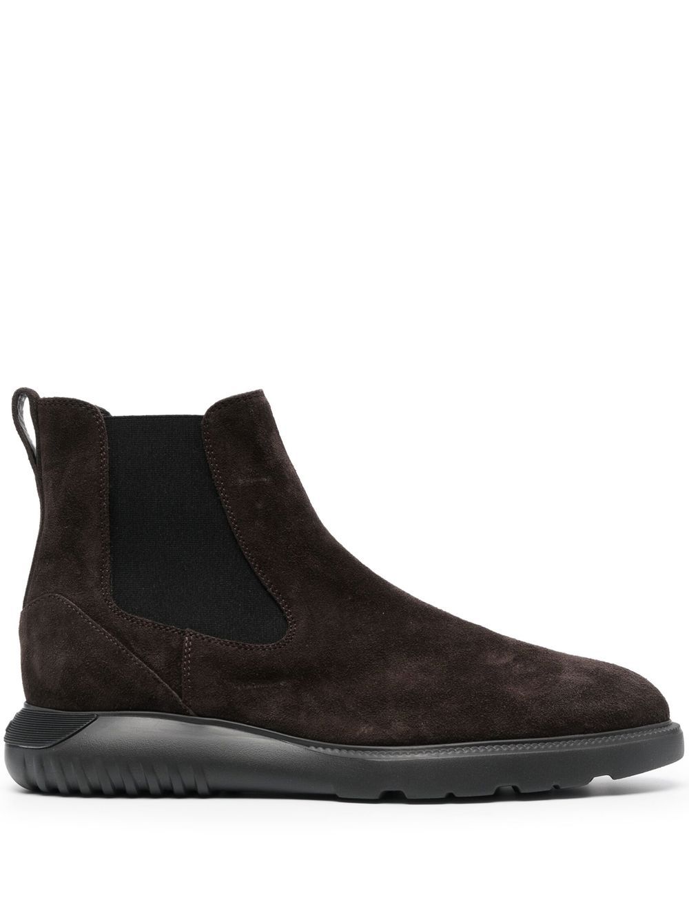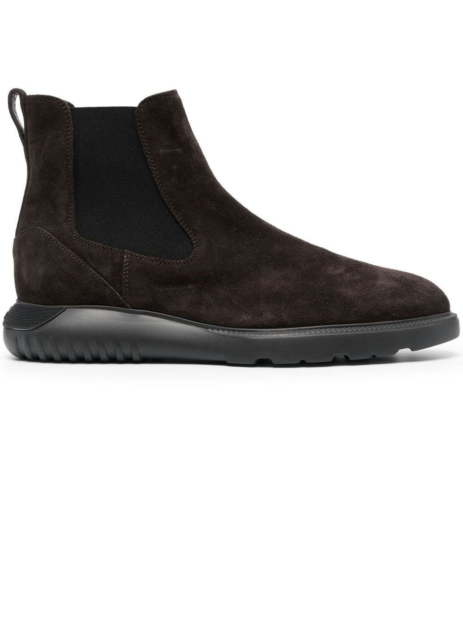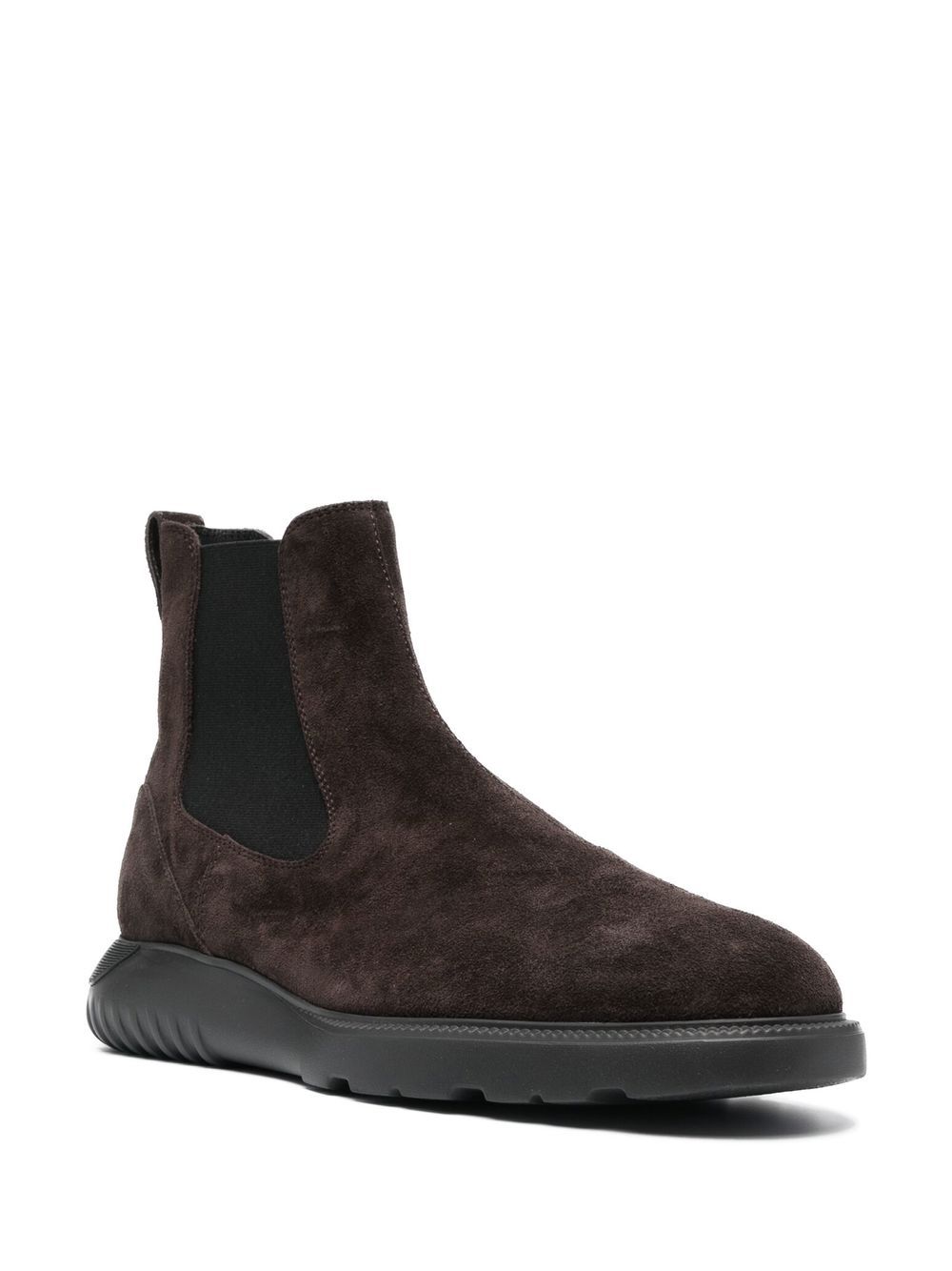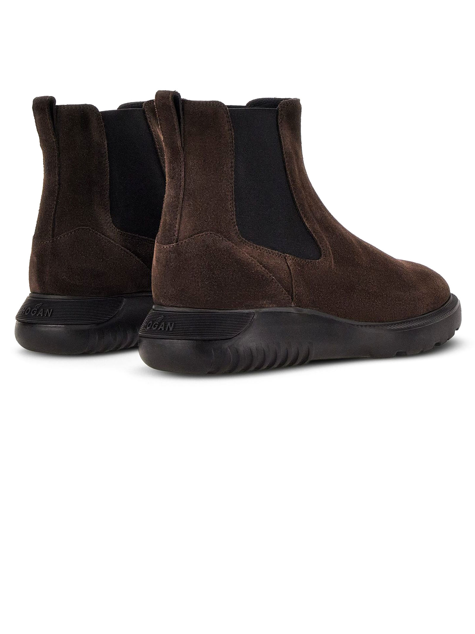 stivaletto in pelle marronepannelli laterali elasticizzatipunta rotondasoletta con marchiosuola piatta in gommapelle scamosciatalunghezza alla caviglia