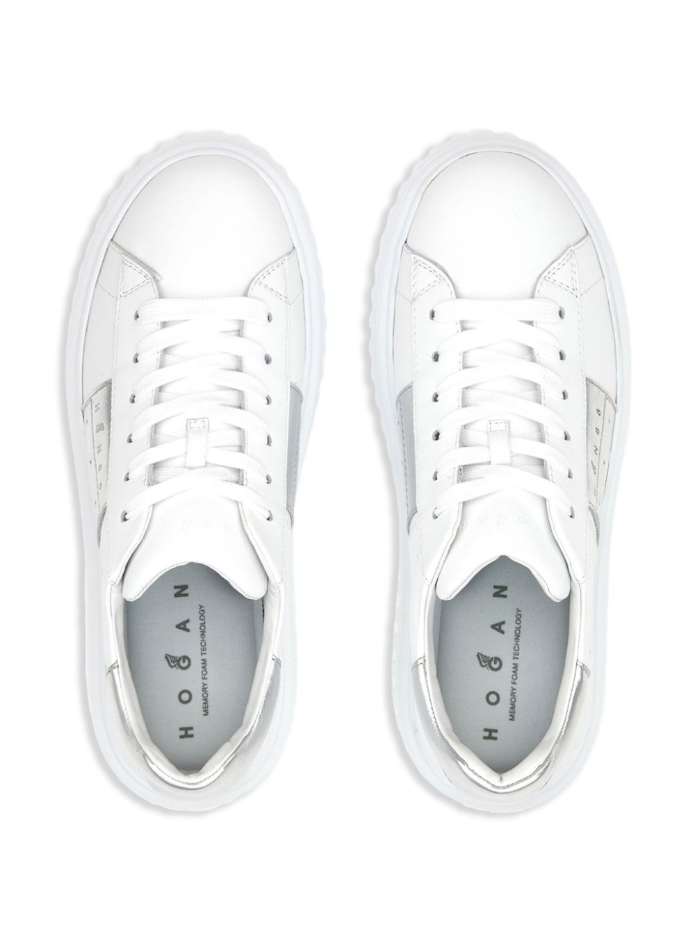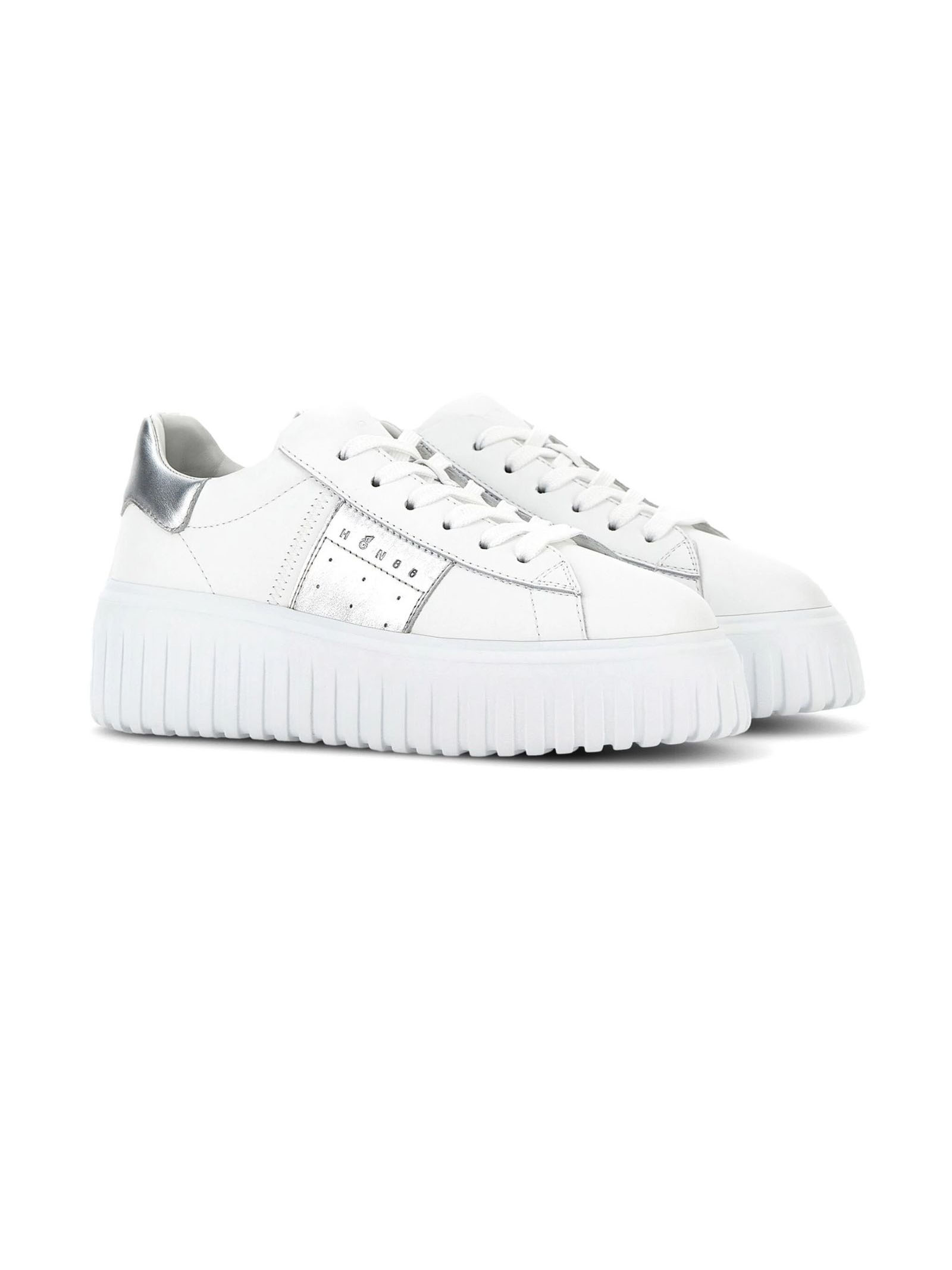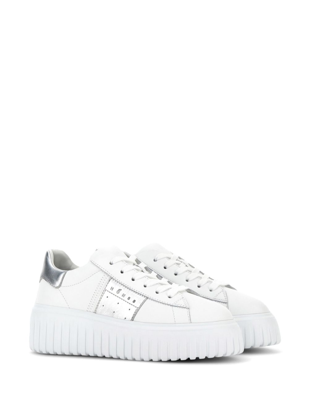 white leather H-stripes sneakerspelle di vitellodesign a pannellifinitura metallicastampa del logo sul latodettagli traforaticontrotacco a contrastopunta rotondachiusura frontale con laccisottopiede in pelle logatosuola di gomma