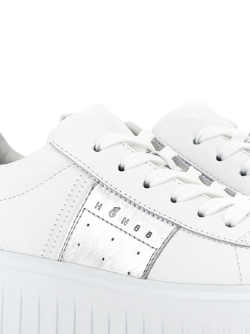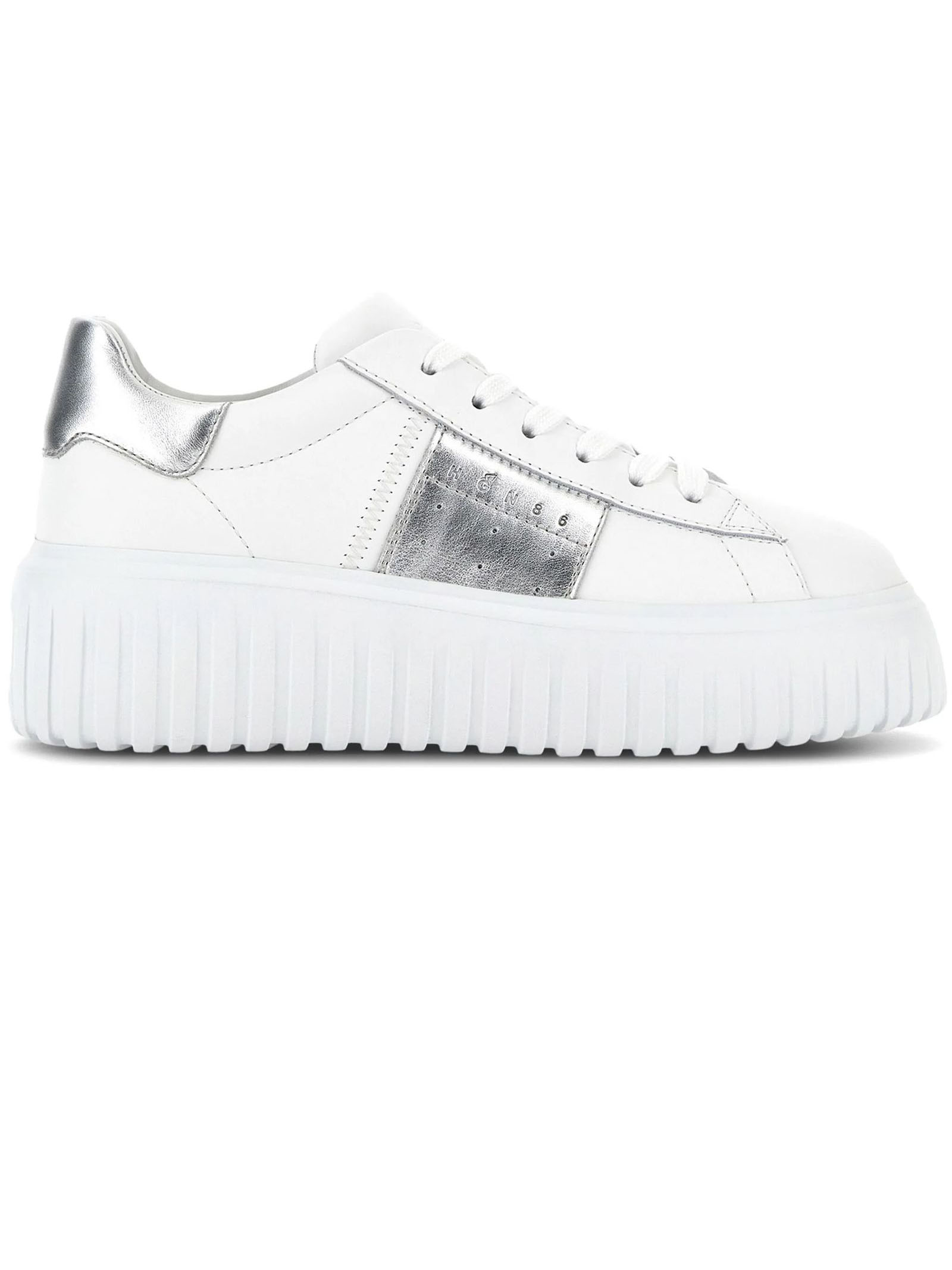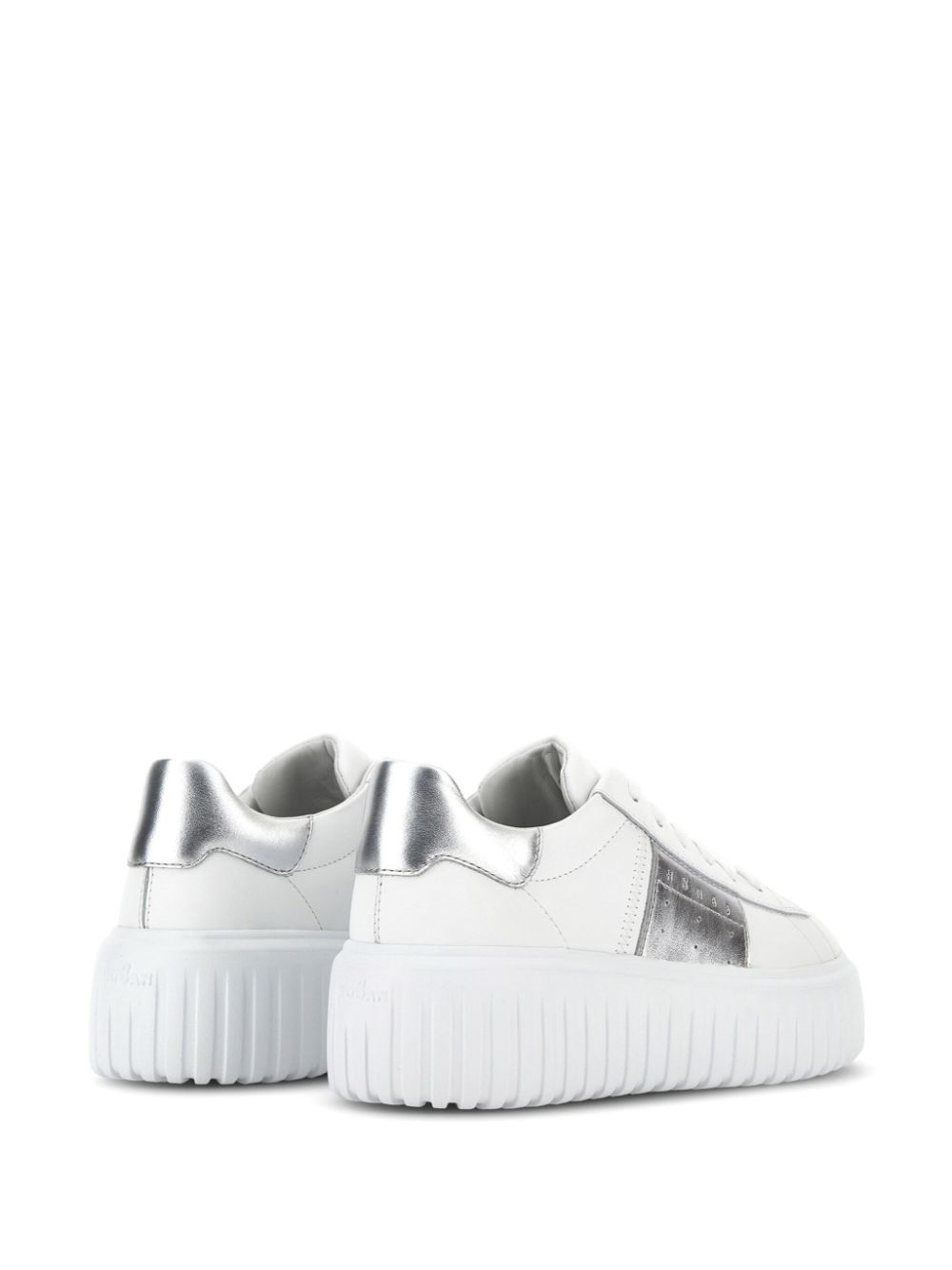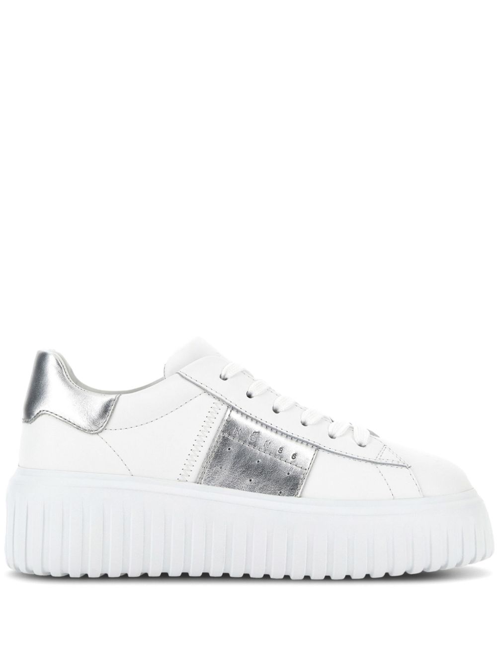 white leather H-stripes sneakerspelle di vitellodesign a pannellifinitura metallicastampa del logo sul latodettagli traforaticontrotacco a contrastopunta rotondachiusura frontale con laccisottopiede in pelle logatosuola di gomma