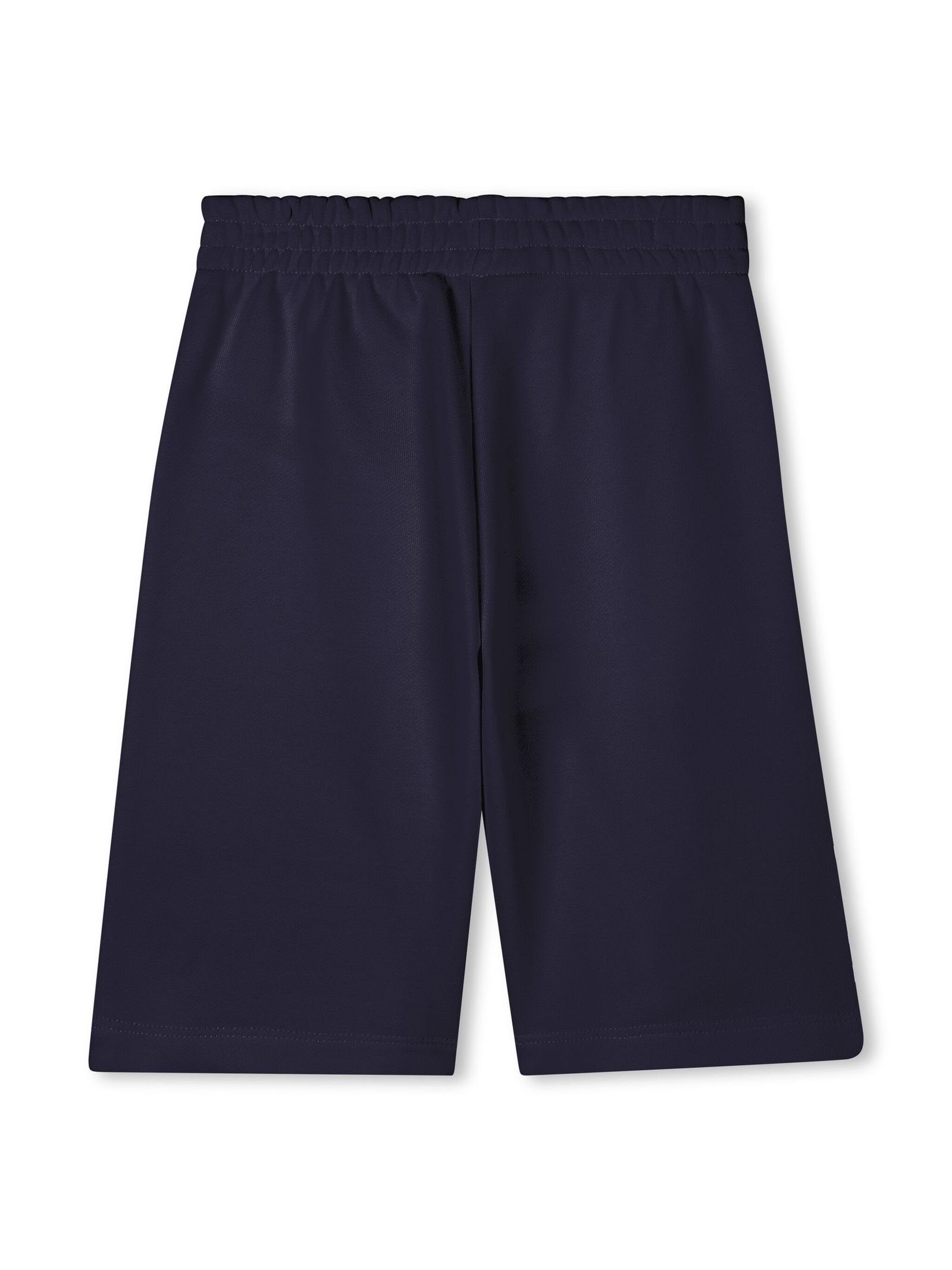 Bermuda in cotone blu navy, vita elasticizzata, due tasche laterali a filetto, applicazione con logo, taglio dritto