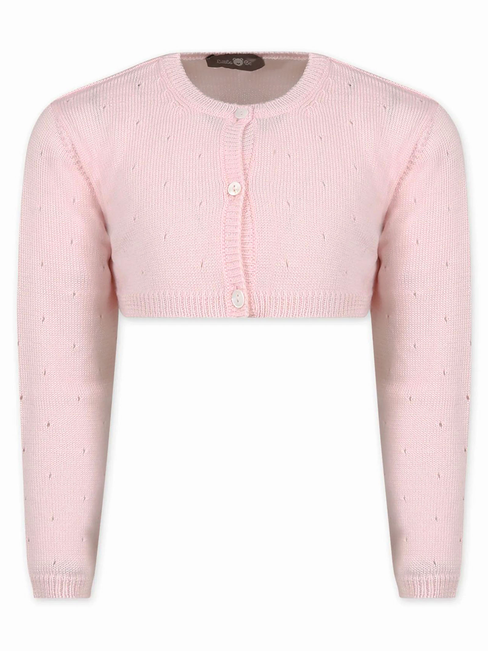Cardigan corto in pura lana vergine rosa, a maniche lunghe, girocollo, polsini e orlo a costine, chiusura frontale con bottoni, dettagli traforati