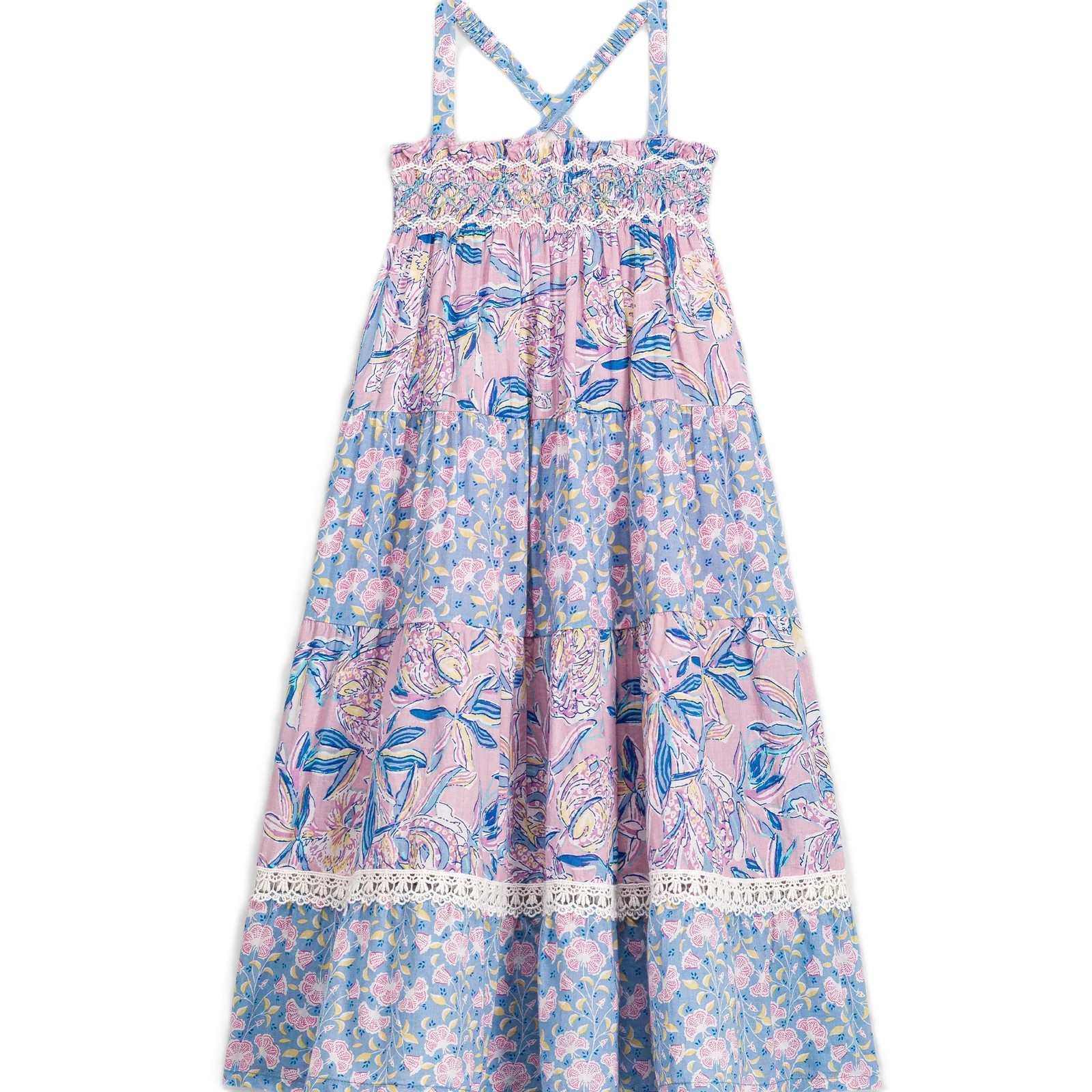 Abito lungo in cotone con velo floreale, ricamato a mano sulla parte superiore, con spalline elastiche regolabili e incrociate sulla schiena, ampio volant in stile fregio sul fondo con dettaglio in pizzo intarsiato, foderato.