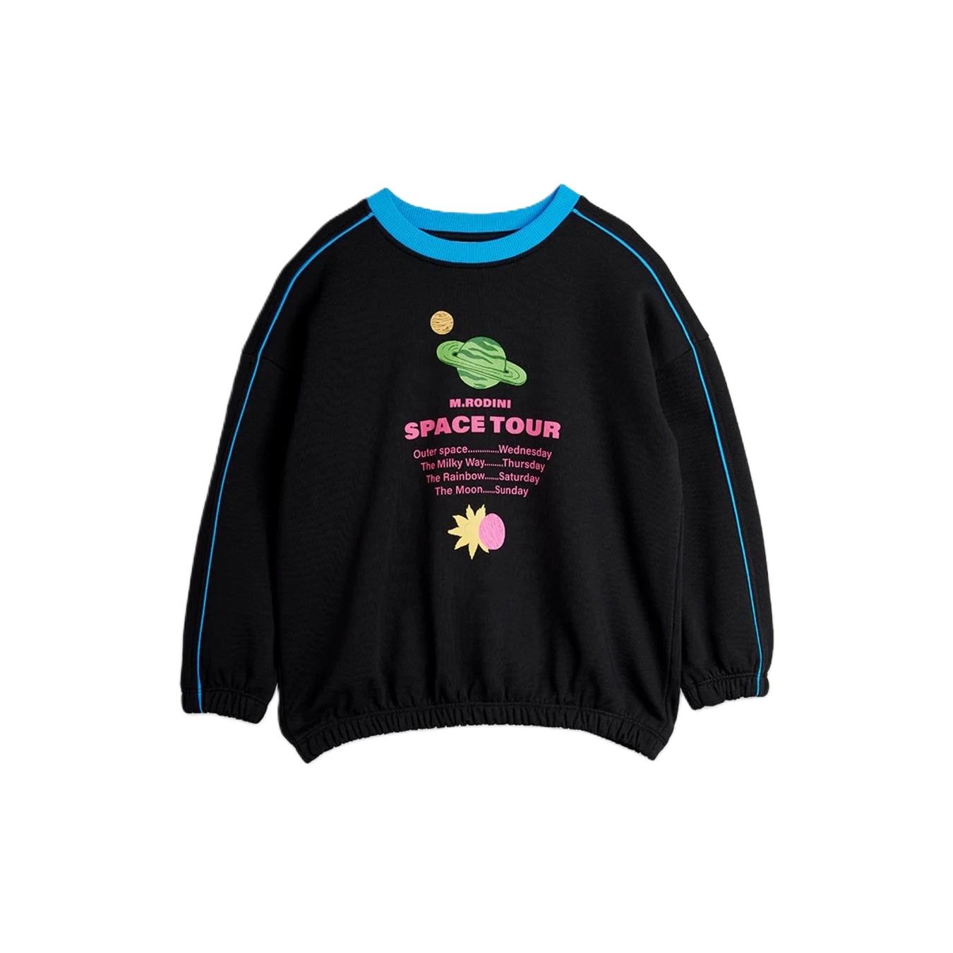 Felpa morbida realizzata al 100% in cotone biologico. Presenta una vestibilità comoda con scollo e polsini a coste, orlo elasticizzato e profili a contrasto lungo le maniche. Rifinita con la stampa Space Tour sul davanti.