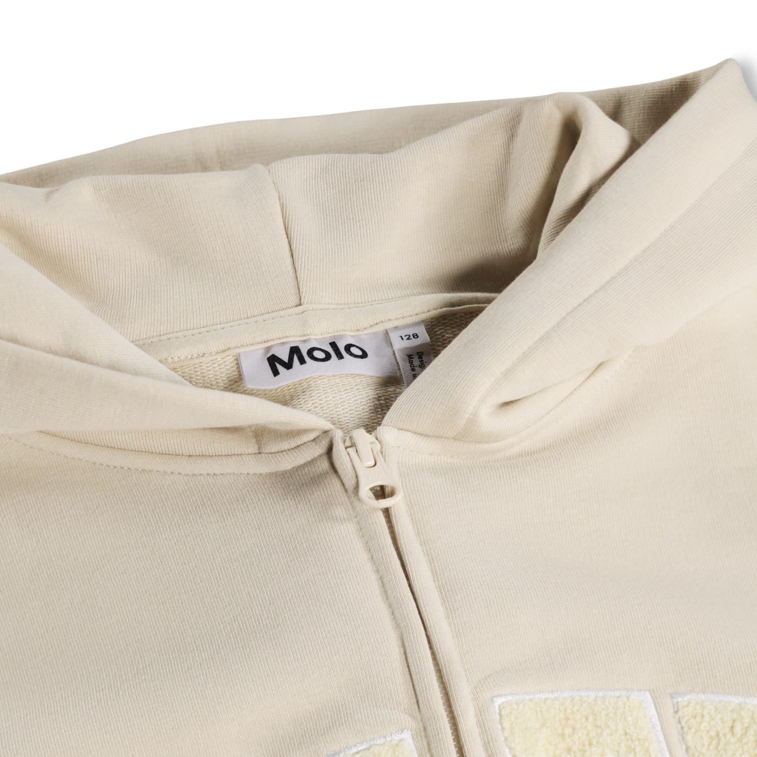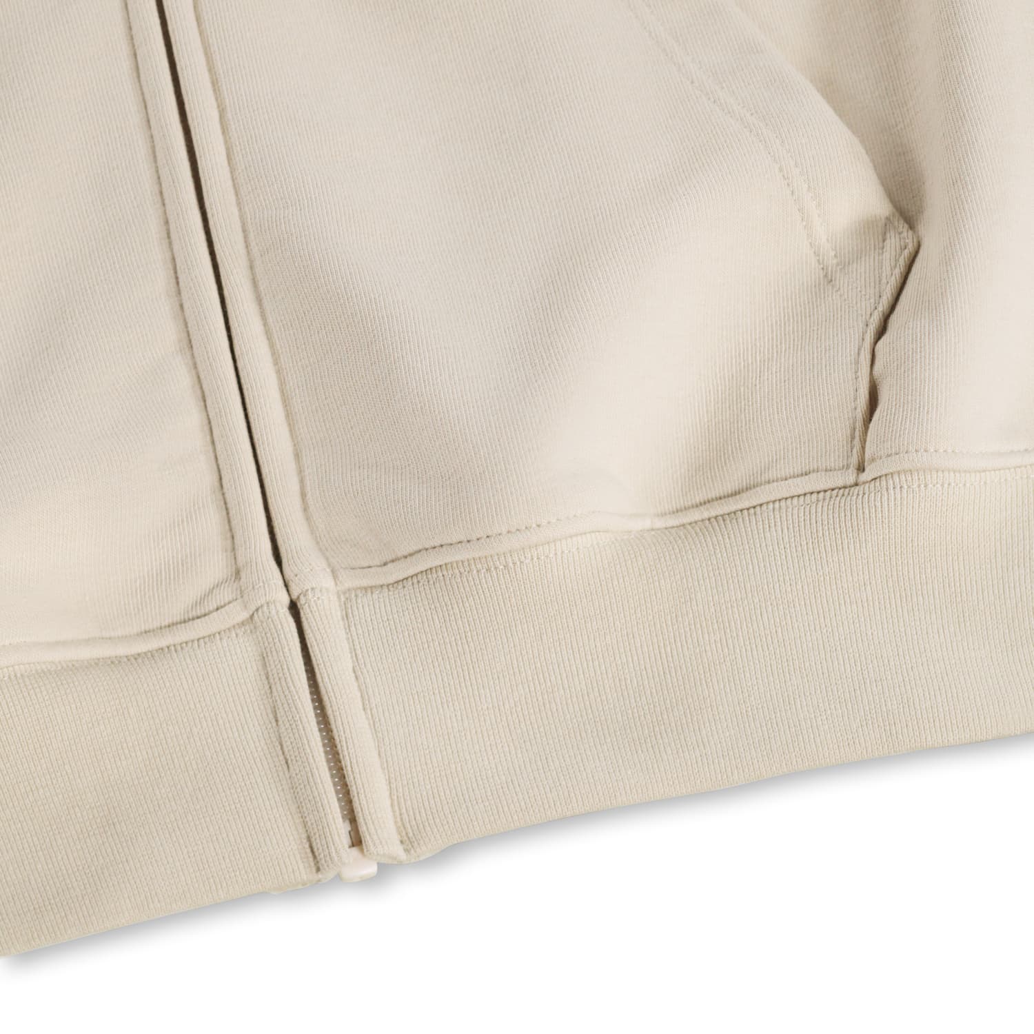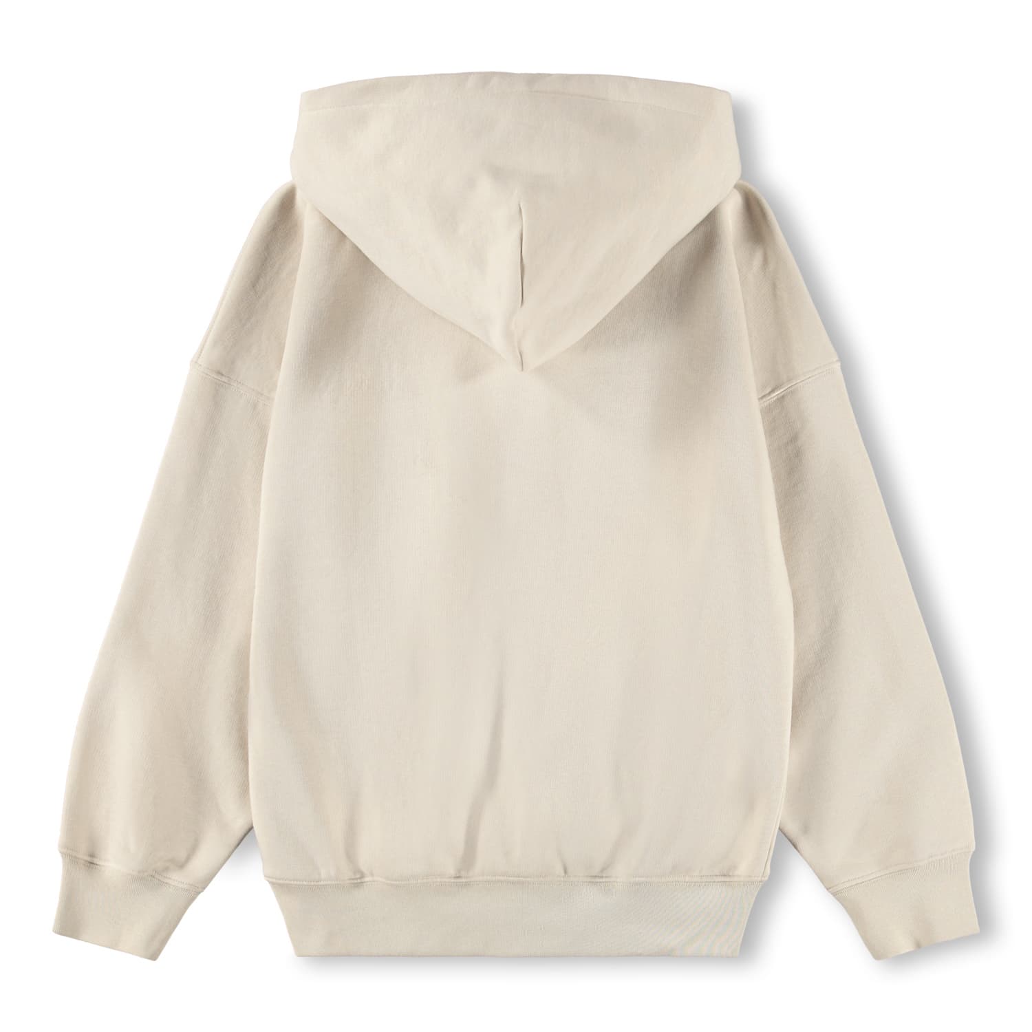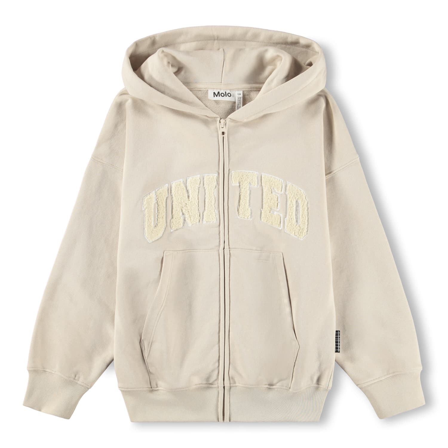 Felpa beige in morbido cotone con tasca a marsupio, chiusura con zip frontale e bordi a coste su maniche e fondo. La felpa ha una vestibilità ampia e rilassata con ricamo sul davanti con la scritta "Únited".