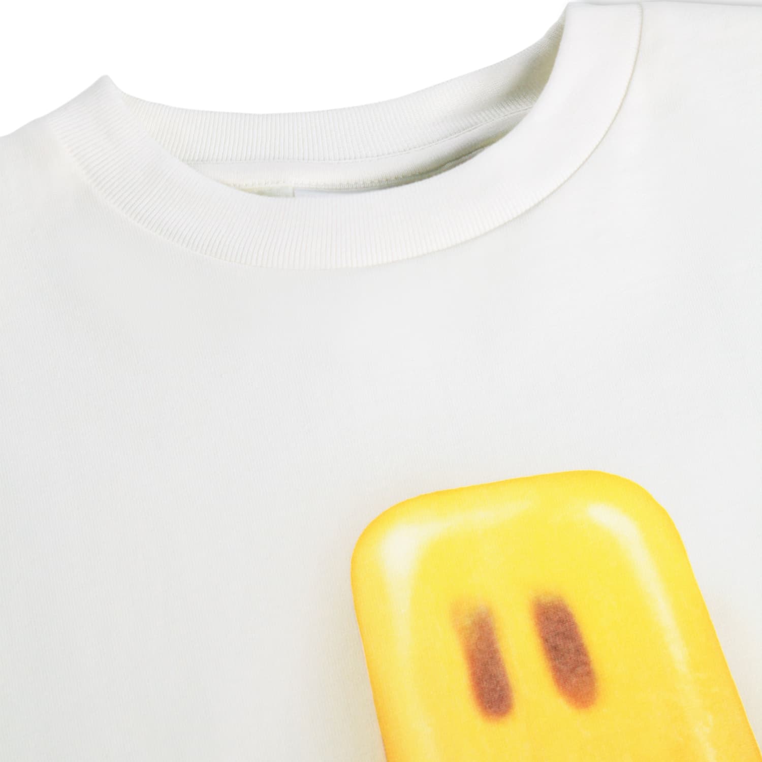 T-shirt bianca in morbido cotone biologico a maniche corte con scollo a coste. La t-shirt ha una vestibilità ampia con la stampa di un gelato e la scritta "Have an ice day".