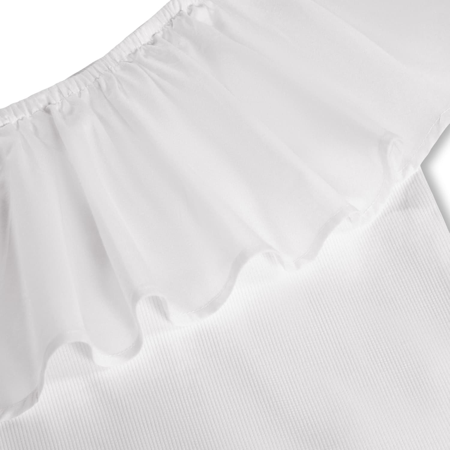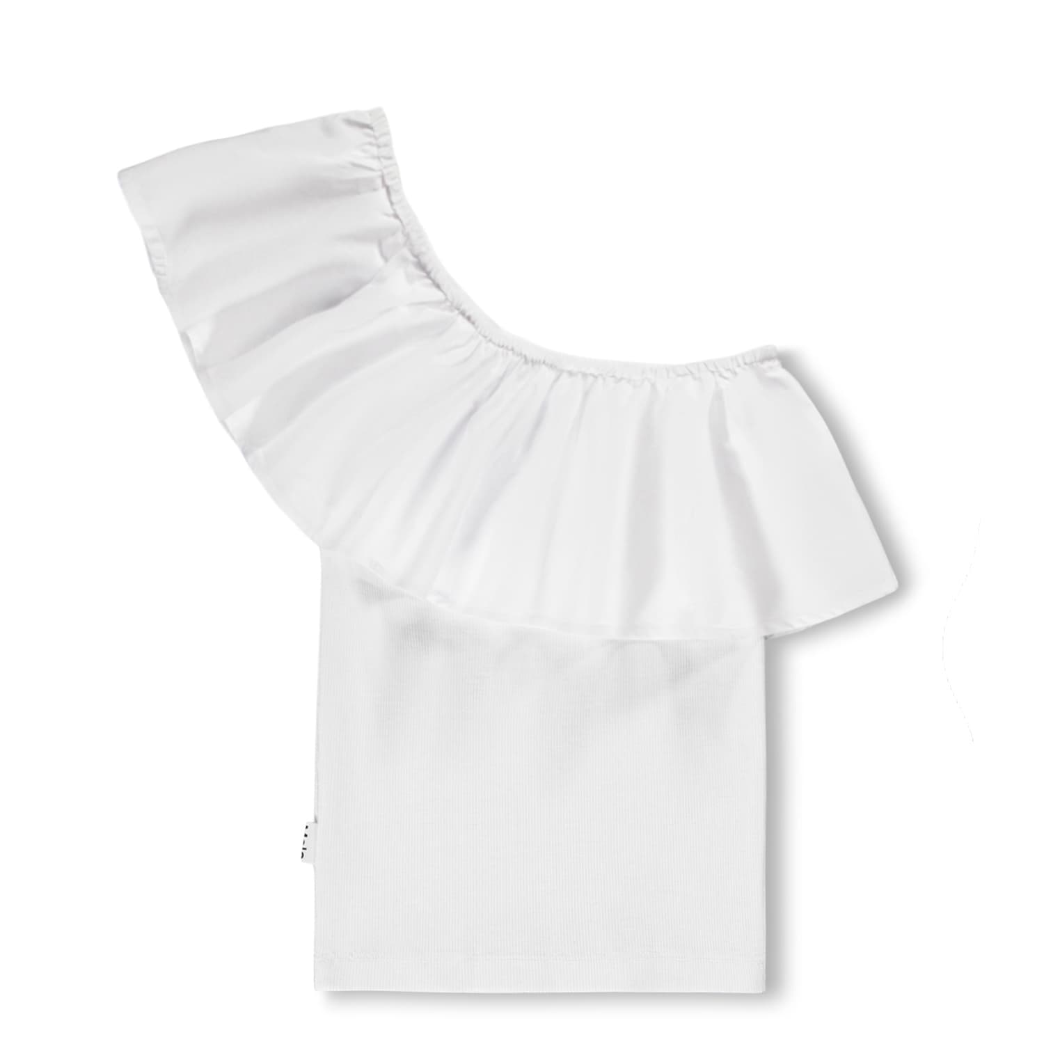 Top bianco monospalla in jersey di cotone biologico, dalla vestibilità aderente e con un'ampia balza in popeline che passa sopra la spalla e intorno alla schiena.