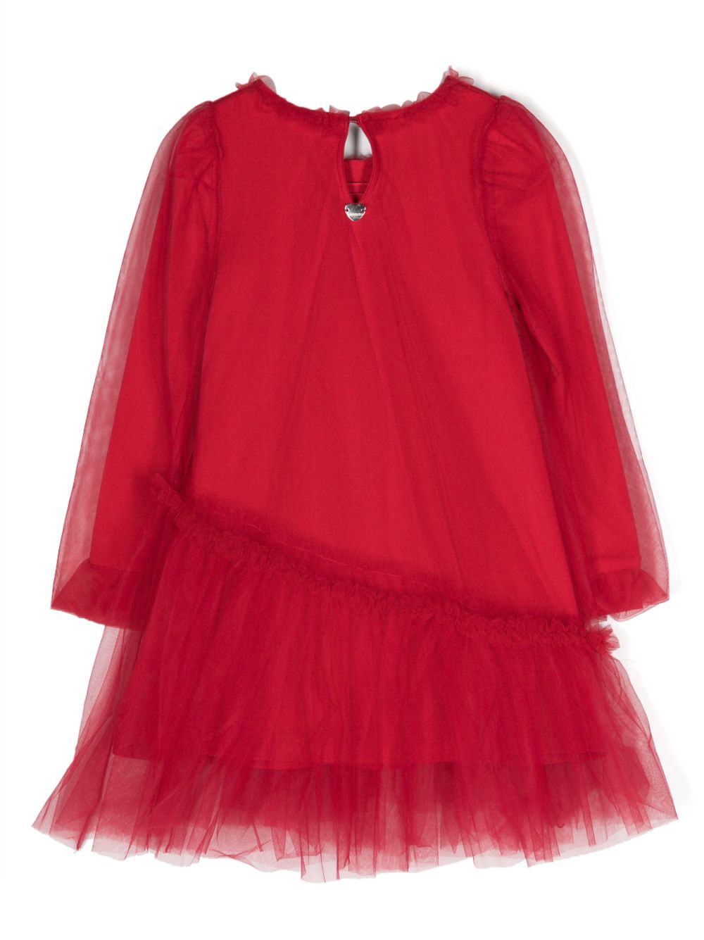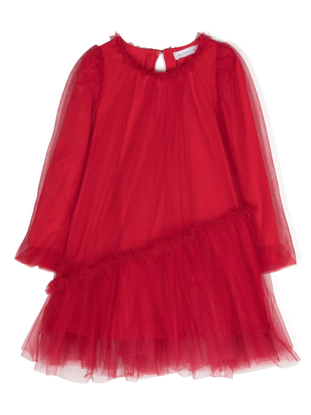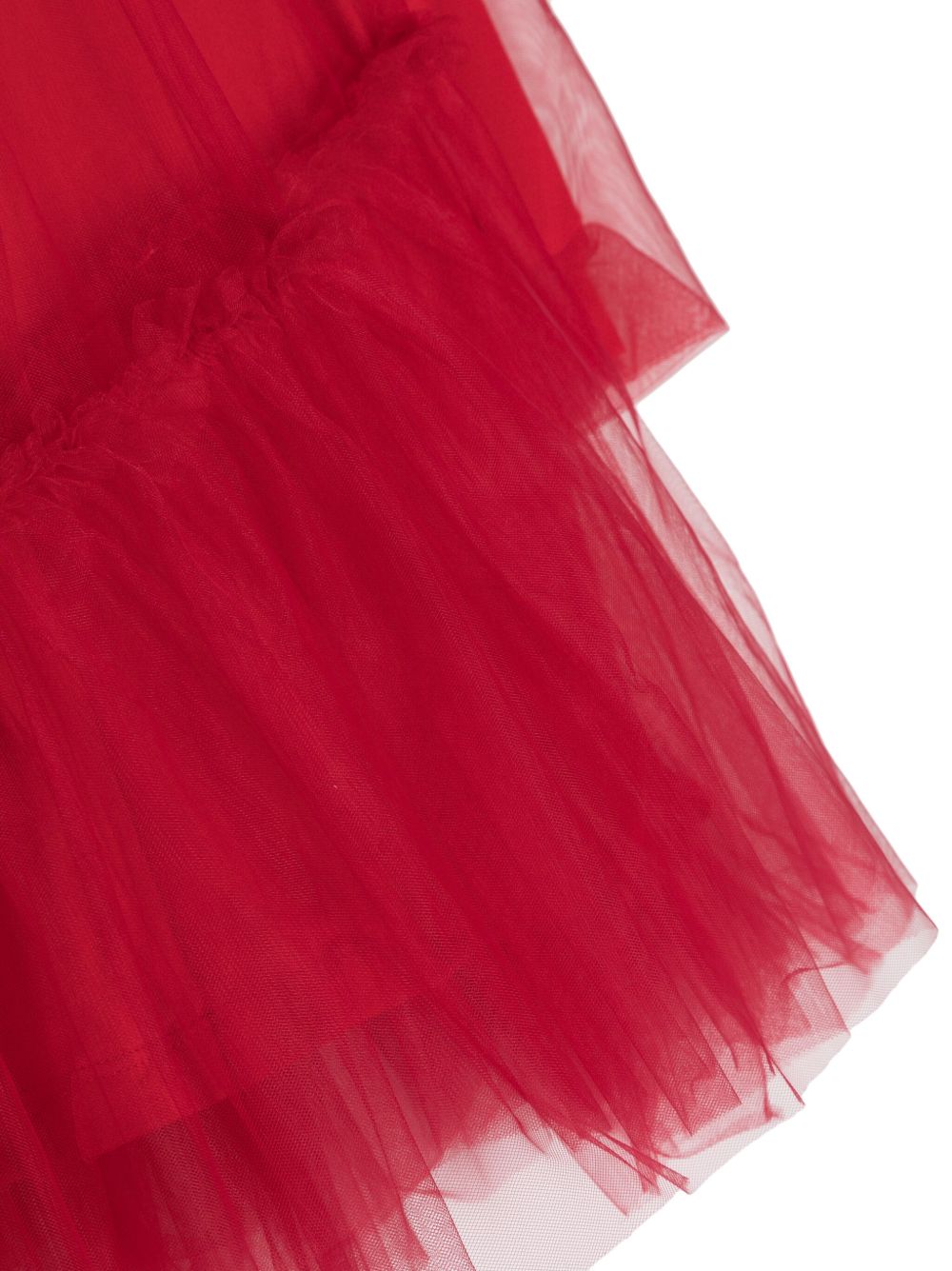 abito in cotone rossocotone elasticizzatorivestimento in tulledettaglio del buco della serratura sul retrodettagli raccoltichiusura con bottone singolo sul retroscollo a balzemaniche lungheorlo peplo