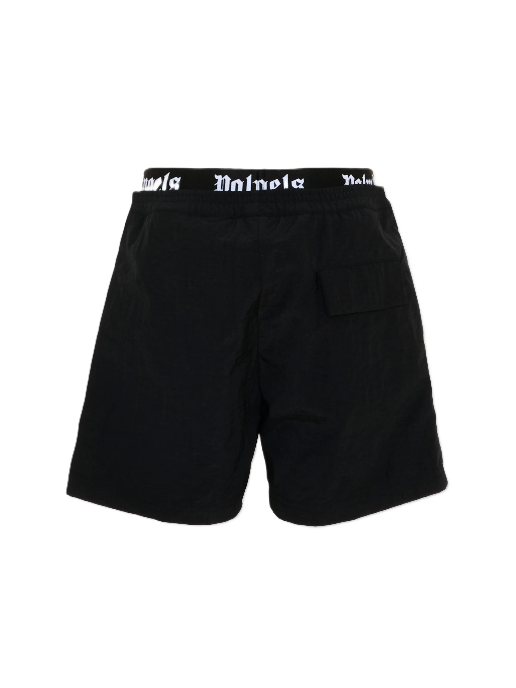 Boxer mare neri Palm Angels in tessuto tecnico leggero con finitura asciutta e compatta. Vita elasticizzata con fascia logata a contrasto che richiama lestetica streetwear del brand e garantisce comfort in movimento. Tasche laterali inserite in cucitura e taschino posteriore applicato completano la funzionalità del modello. Lunghezza media e logo sul fondo gamba creano un profilo essenziale dalla grafica pulita.