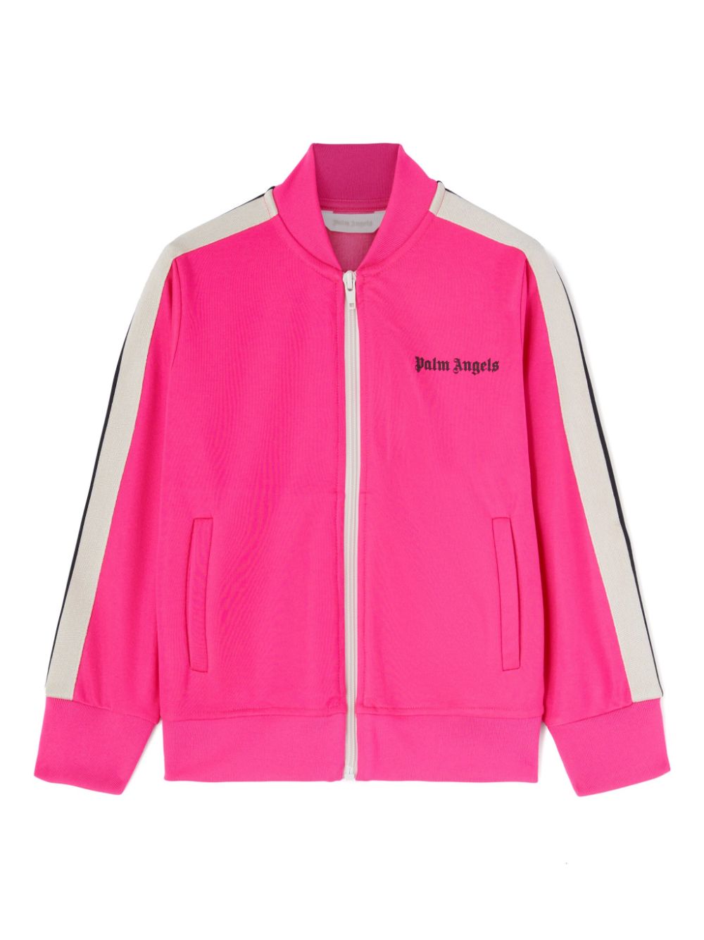 Giacca sportiva fucsia con stampa, chiusura frontale con zip, due tasche a filetto frontali, colletto a coste, maniche lunghe