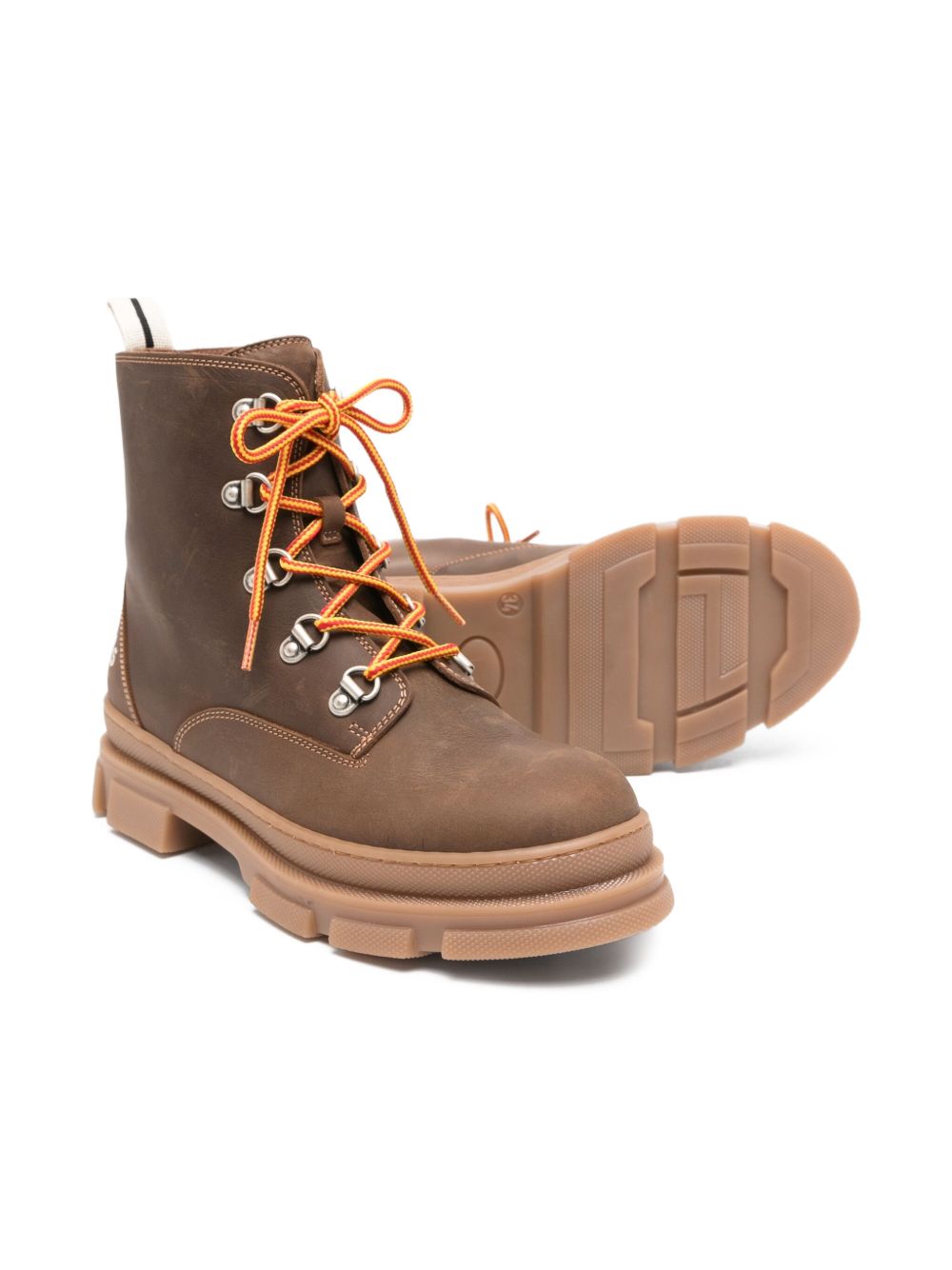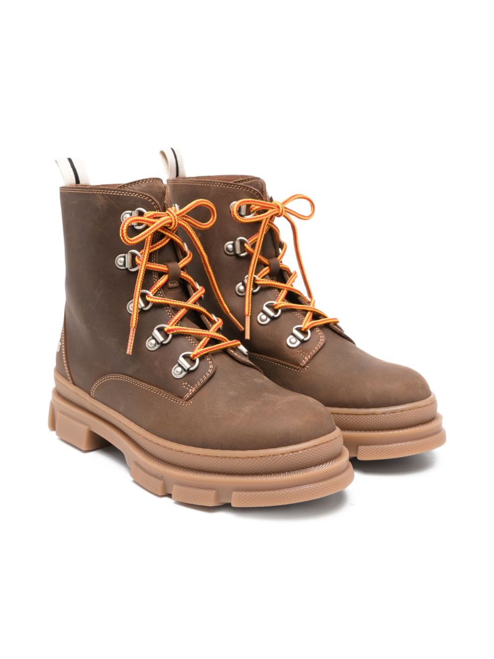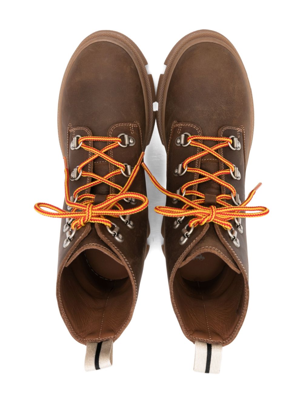 tomaia in pelle marrone, allacciatura con lacci, occhielli, suola spessa, punta tonda