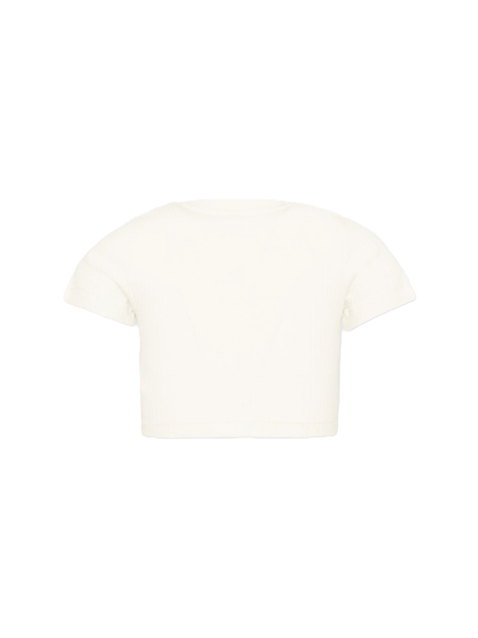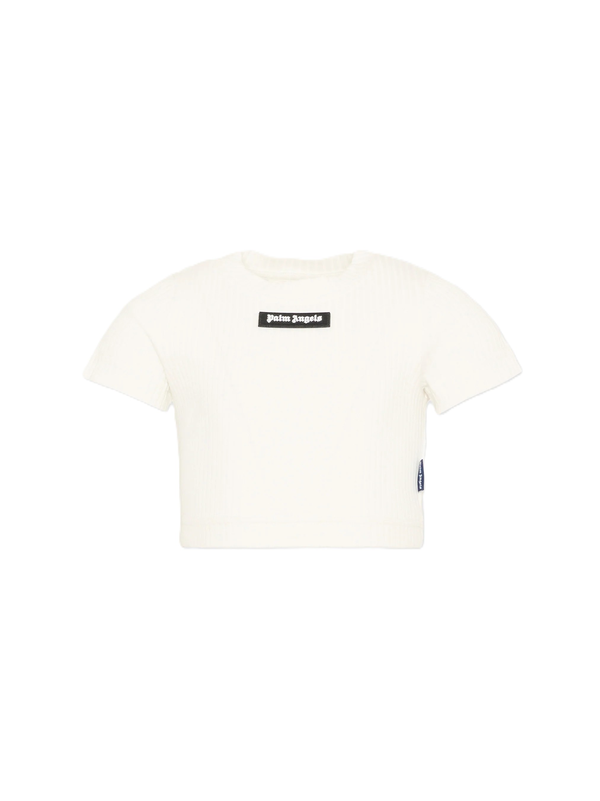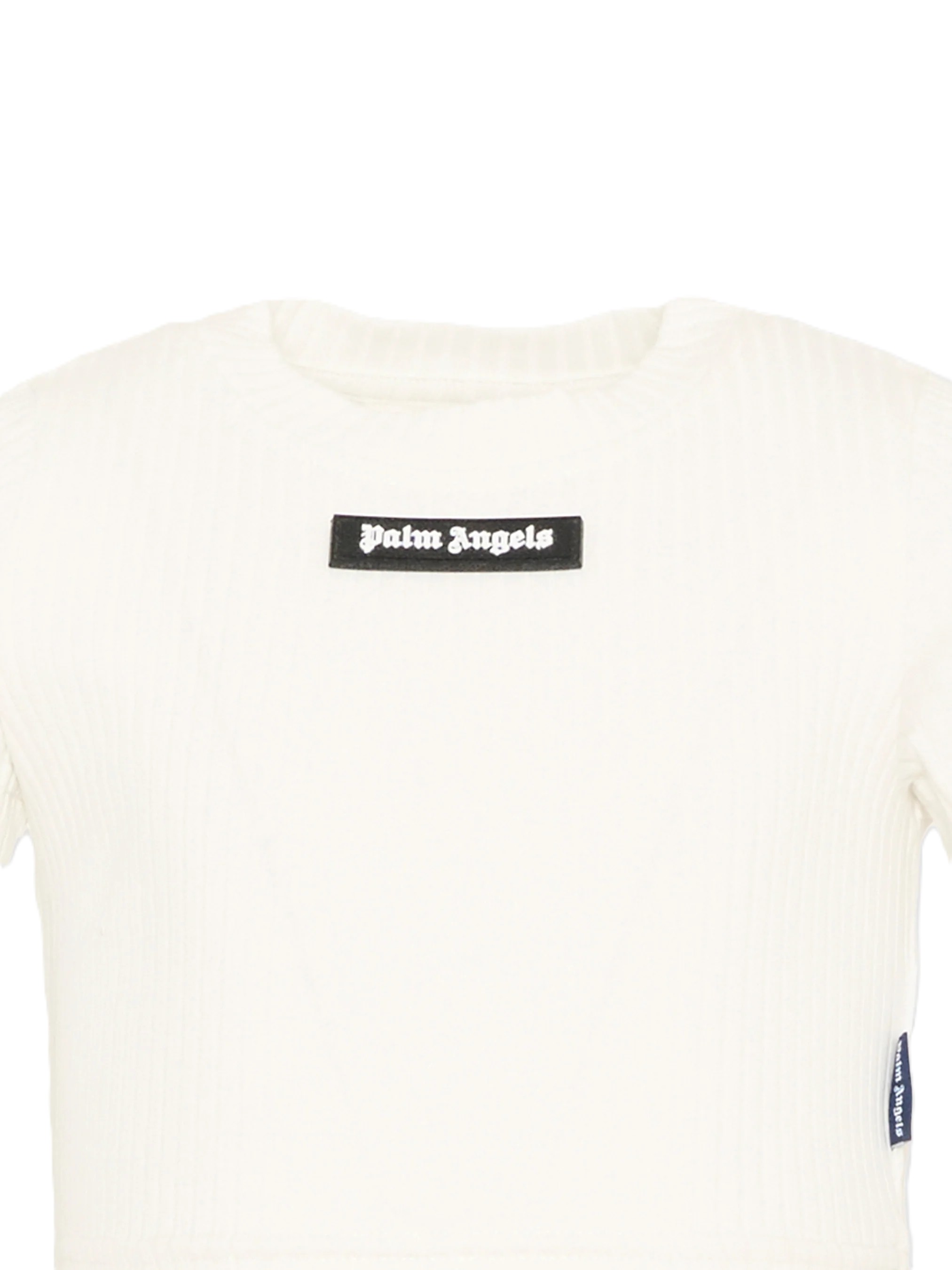 T-shirt a manica corta in jersey di cotone a coste Palm Angels dalla linea cropped e aderente. Il modello avorio presenta girocollo rifinito in maglia a costine e profilo leggermente elasticizzato sul fondo che segue il busto senza costringere. Sul davanti spicca il patch logo nero a contrasto, mentre il retro resta pulito per valorizzare leffetto verticale della lavorazione a coste.