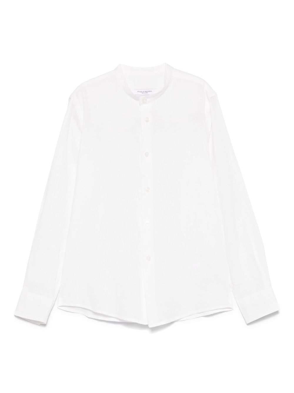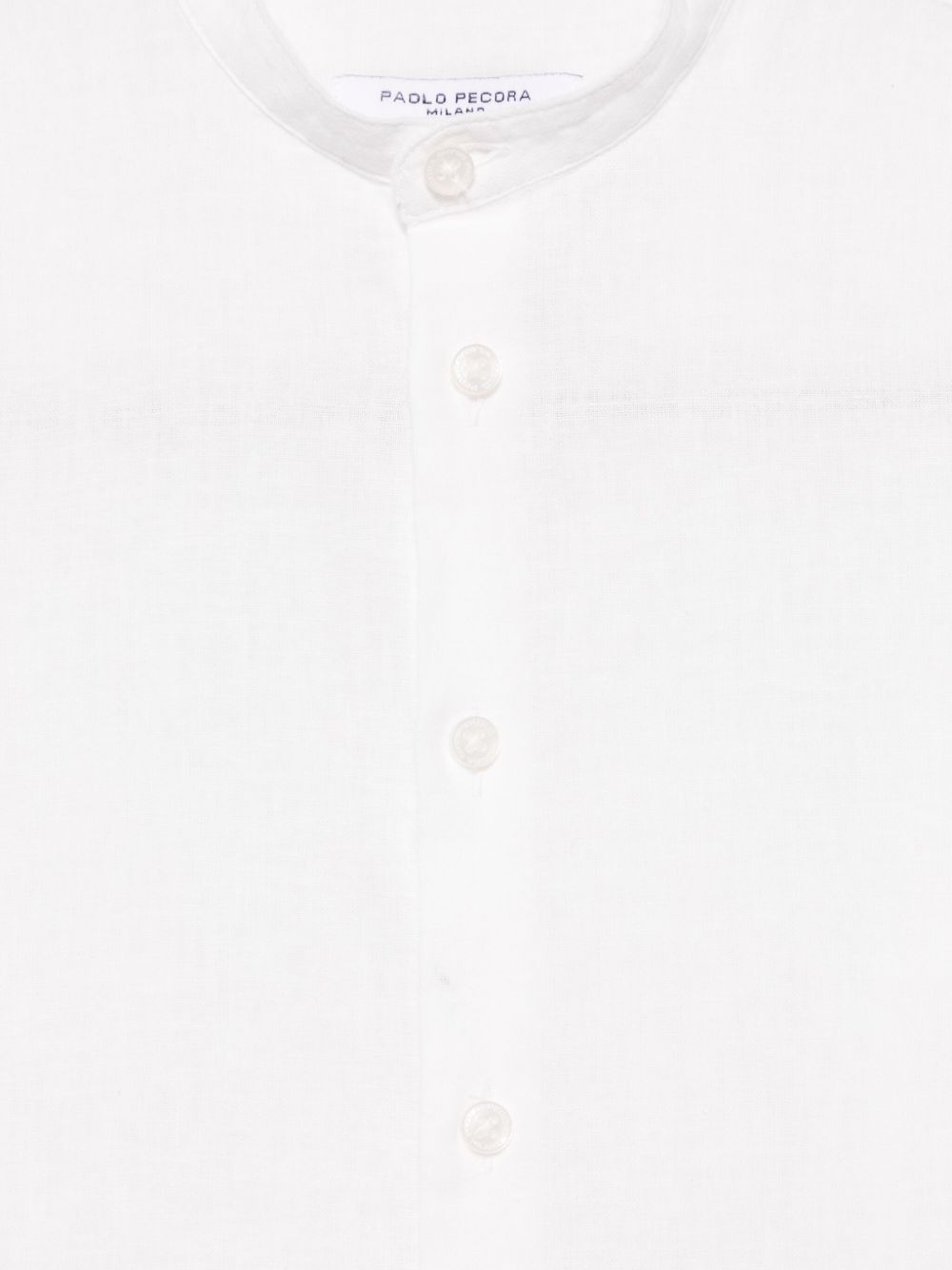 Camicia in cotone bianco, chiusura frontale con bottoni, polsini con abbottonatura, orlo curvo, colletto alla coreana