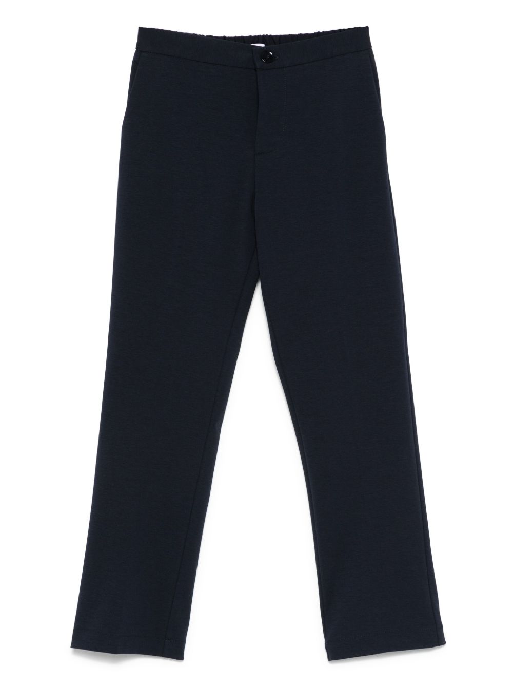 Pantaloni dritti blu notte, chiusura frontale con bottoni e zip, due tasche laterali, tasca posteriore a filetto, vita elasticizzata sul retro
