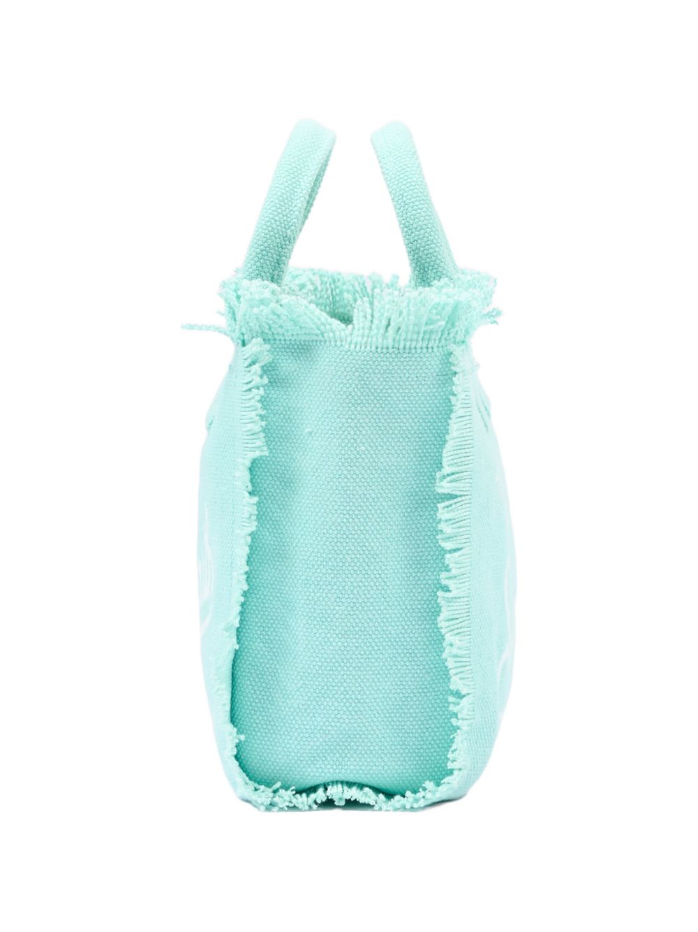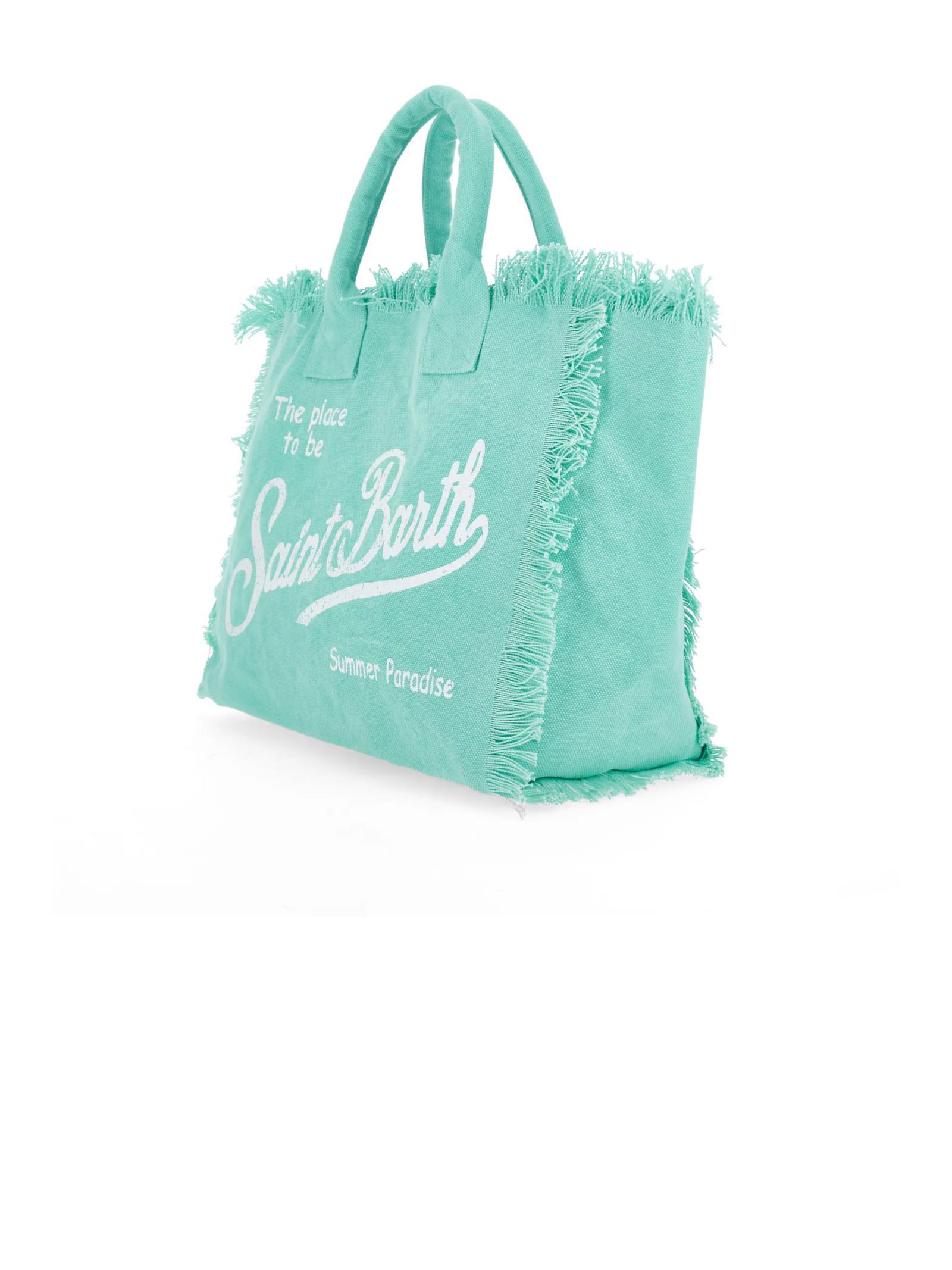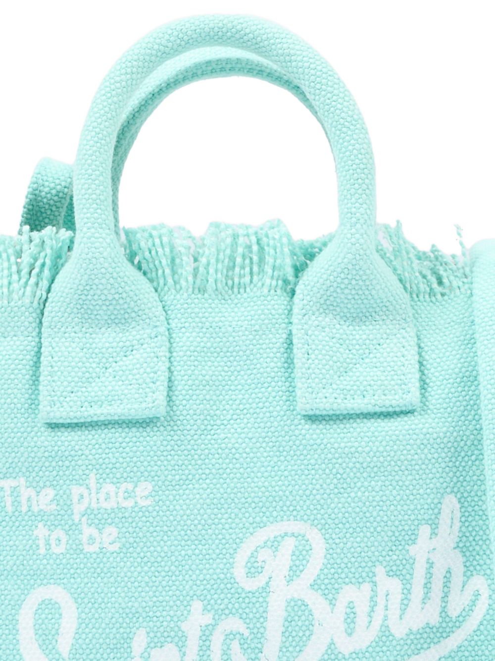 Borsa a mano Vanity in canvas di cotone verde con chiusura superiore con zip, doppio manico superiore in tela, lettering logo a contrasto in glitter, dettaglio frange sul bordo superiore e ai lati, uno scomparto principale, una tasca con zip, una tasca p