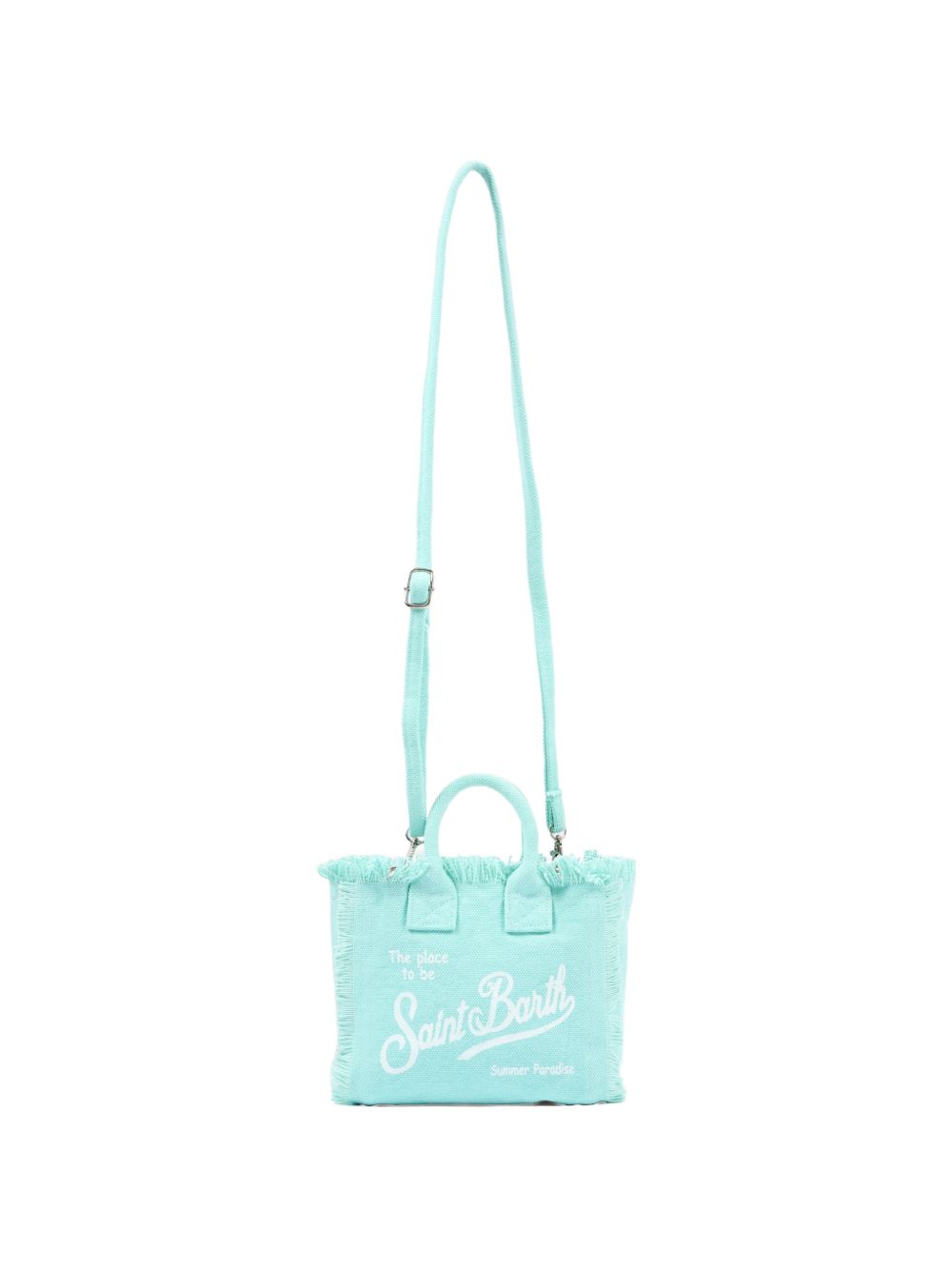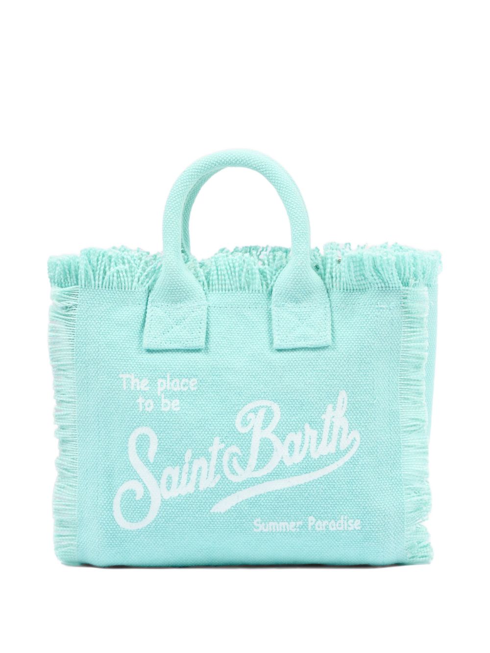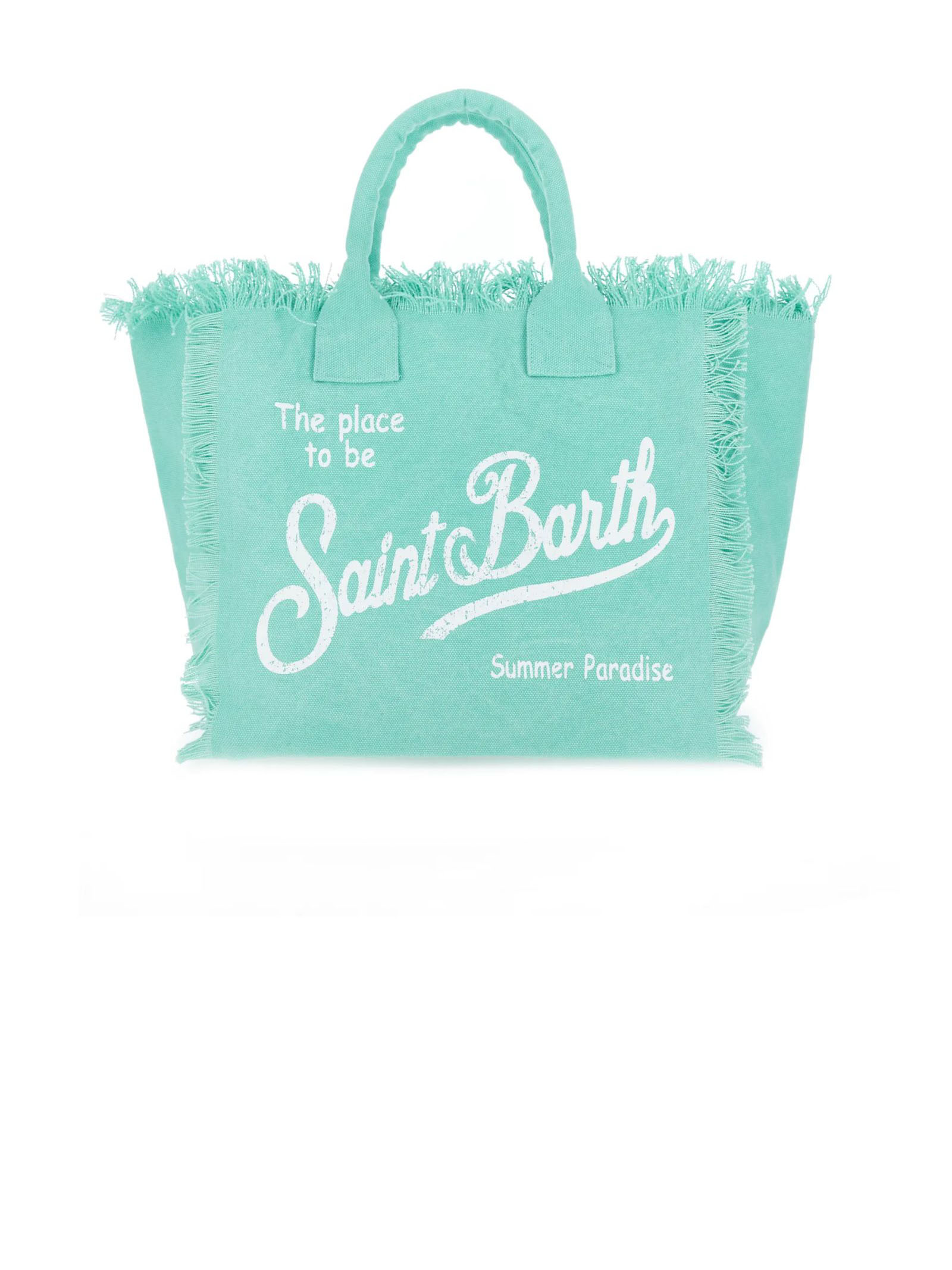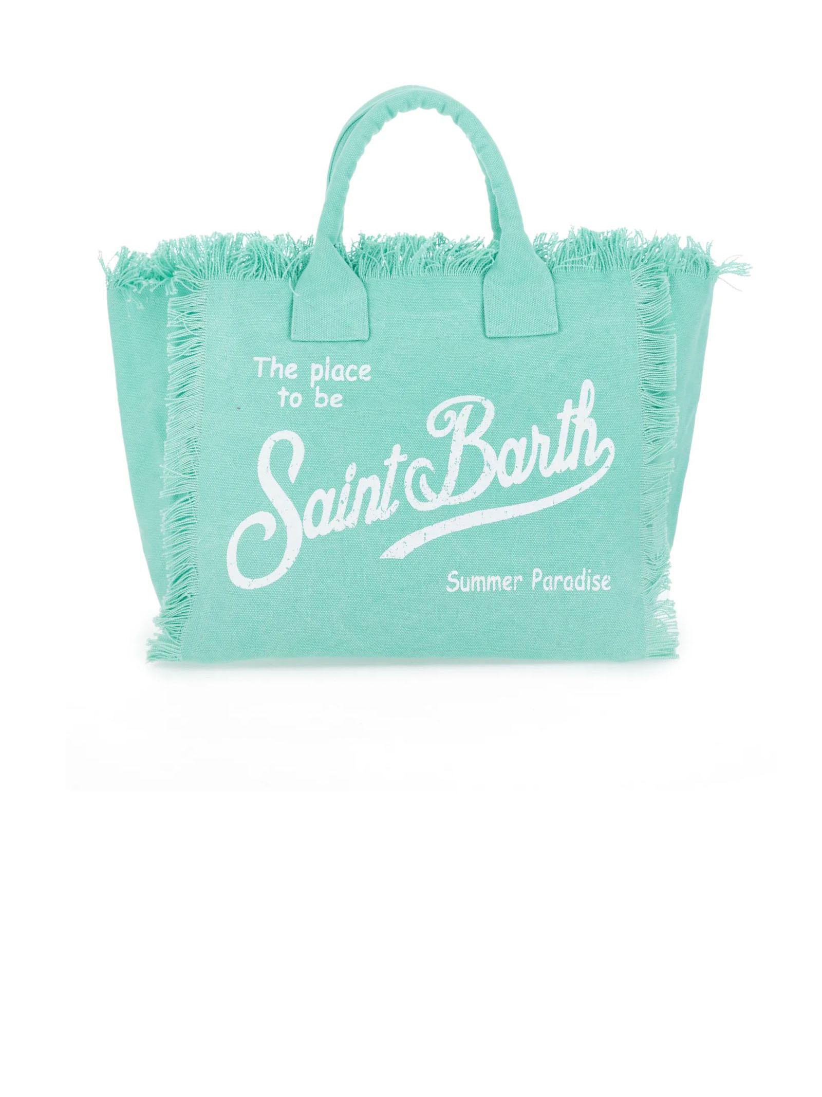Borsa a mano Vanity in canvas di cotone verde con chiusura superiore con zip, doppio manico superiore in tela, lettering logo a contrasto in glitter, dettaglio frange sul bordo superiore e ai lati, uno scomparto principale, una tasca con zip, una tasca p