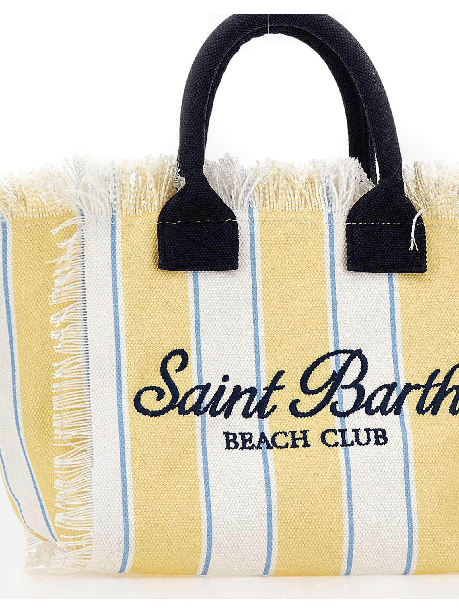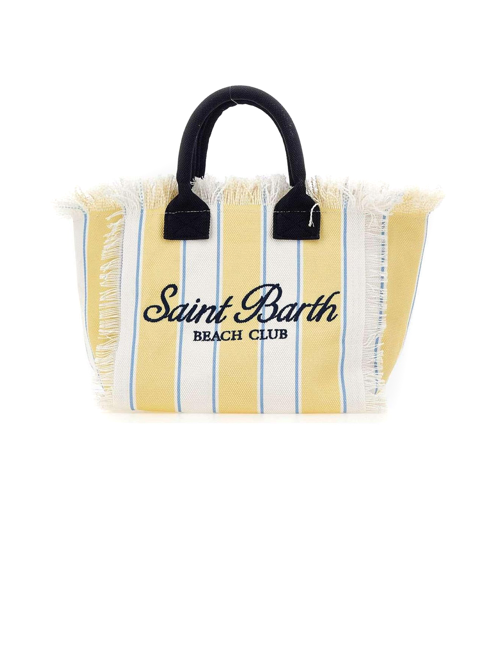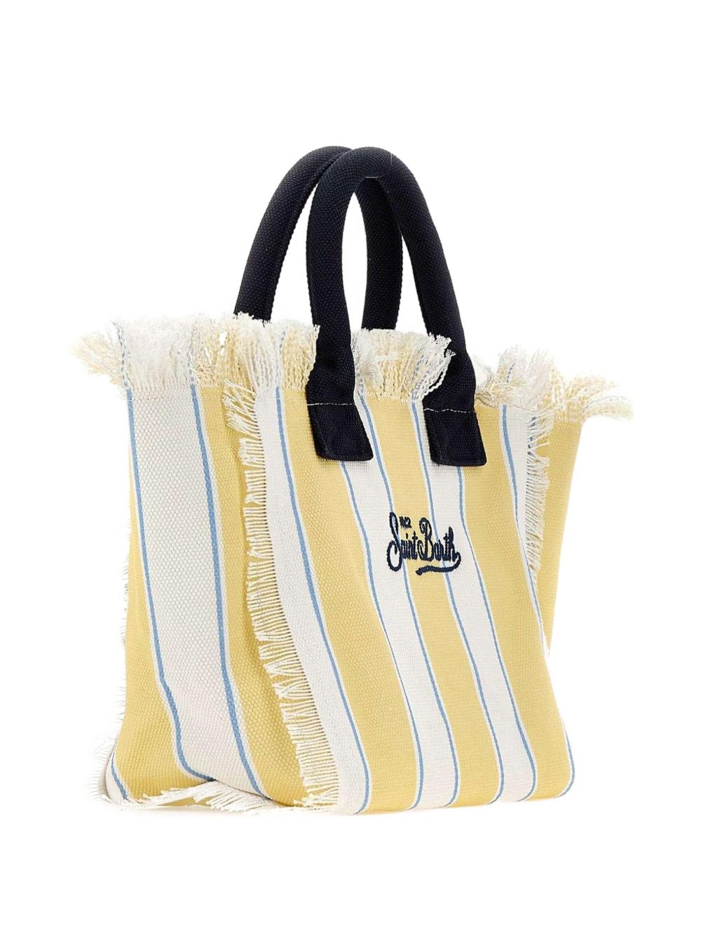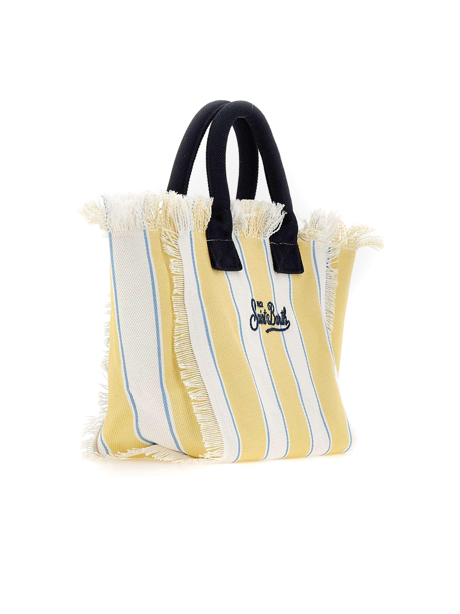 Borsa in canvas di cotone giallo e bianco, con dettaglio di frange, tasca interna, chiusura con zip, doppi manici tubolari, tracolla regolabile e removibile, stampa a righe con maxi logo stampato a contrasto, 26 x 23 x 15 cm