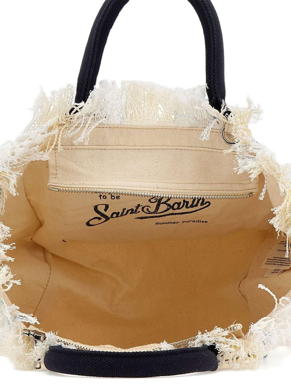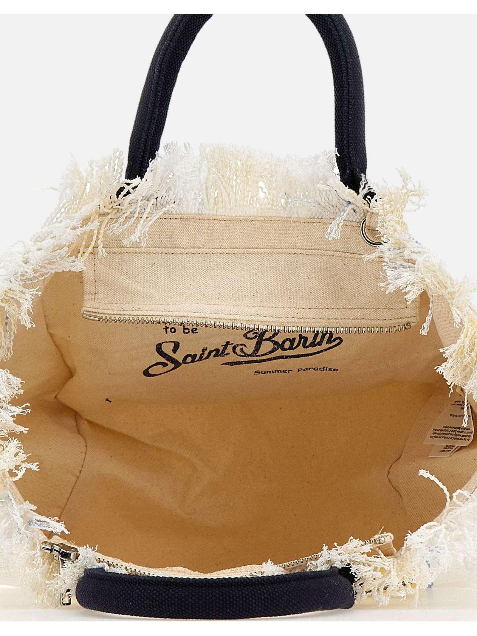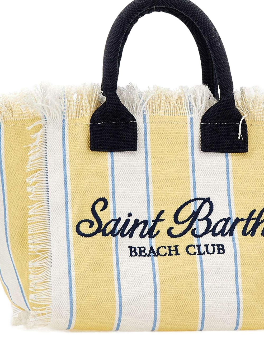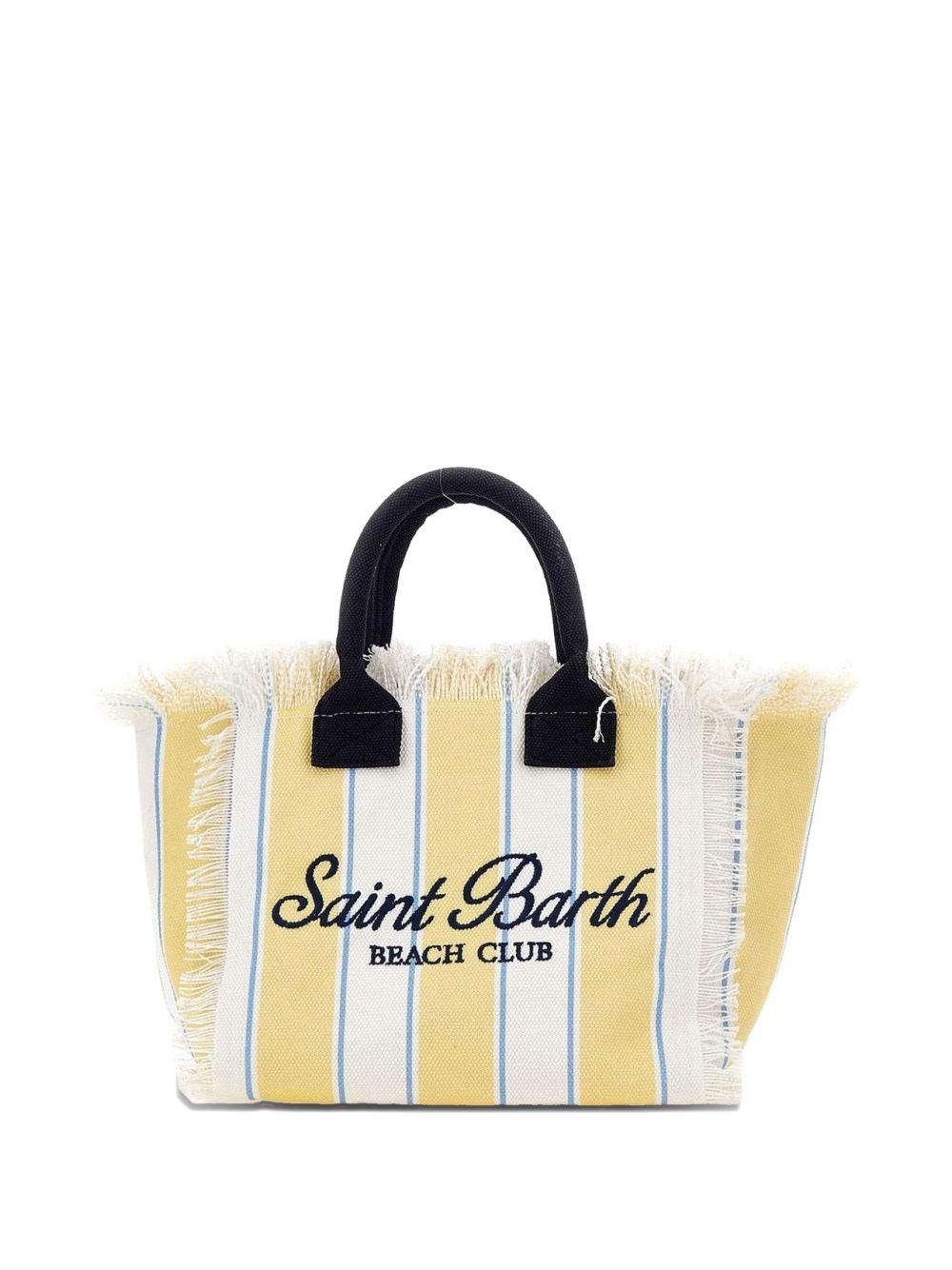 Borsa in canvas di cotone giallo e bianco, con dettaglio di frange, tasca interna, chiusura con zip, doppi manici tubolari, tracolla regolabile e removibile, stampa a righe con maxi logo stampato a contrasto, 26 x 23 x 15 cm