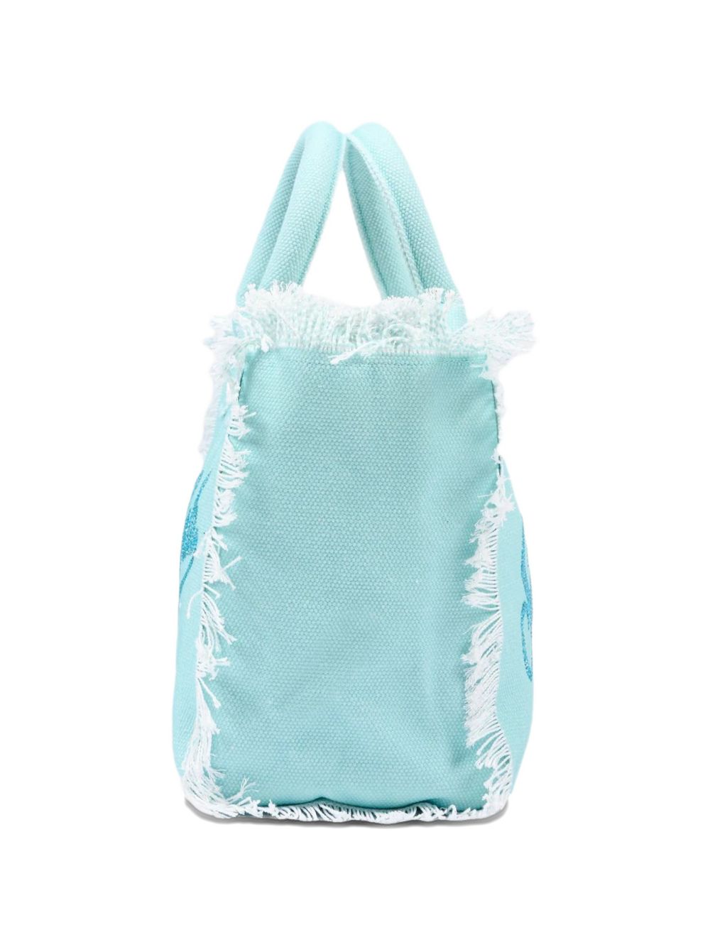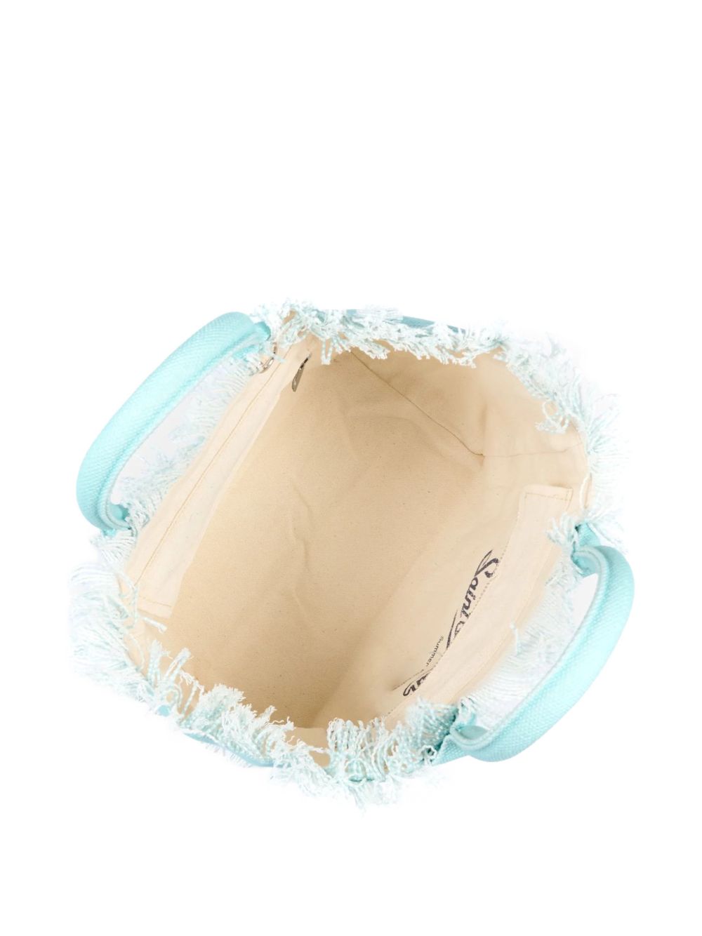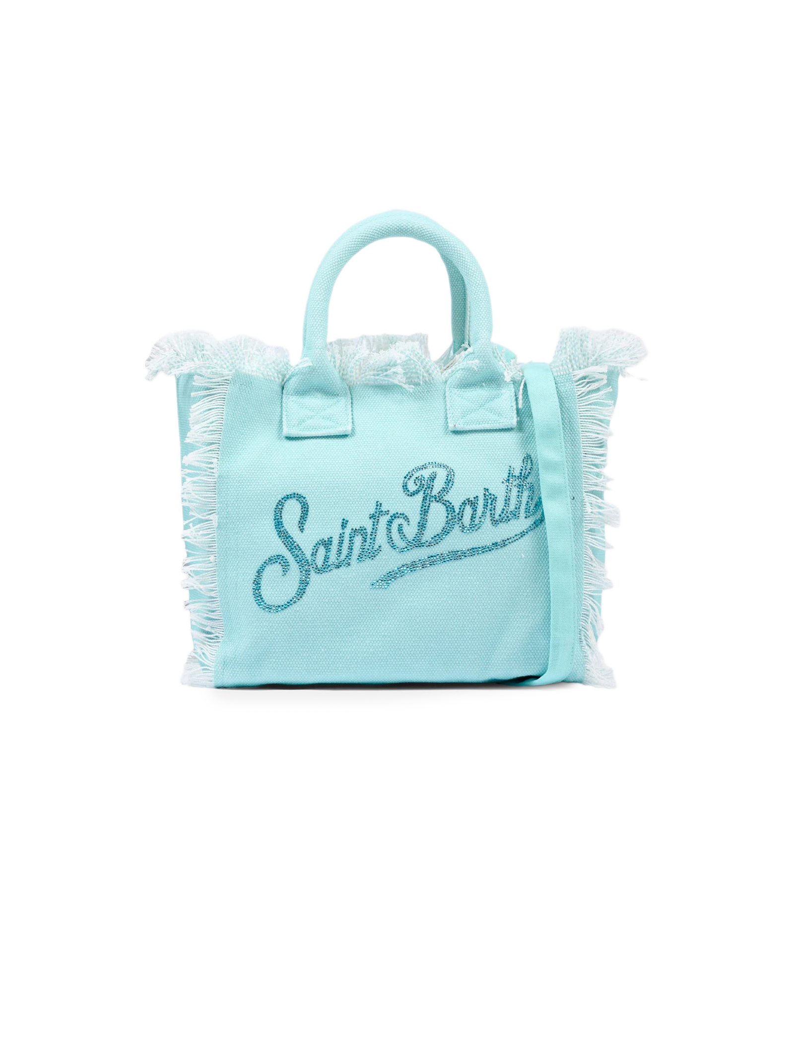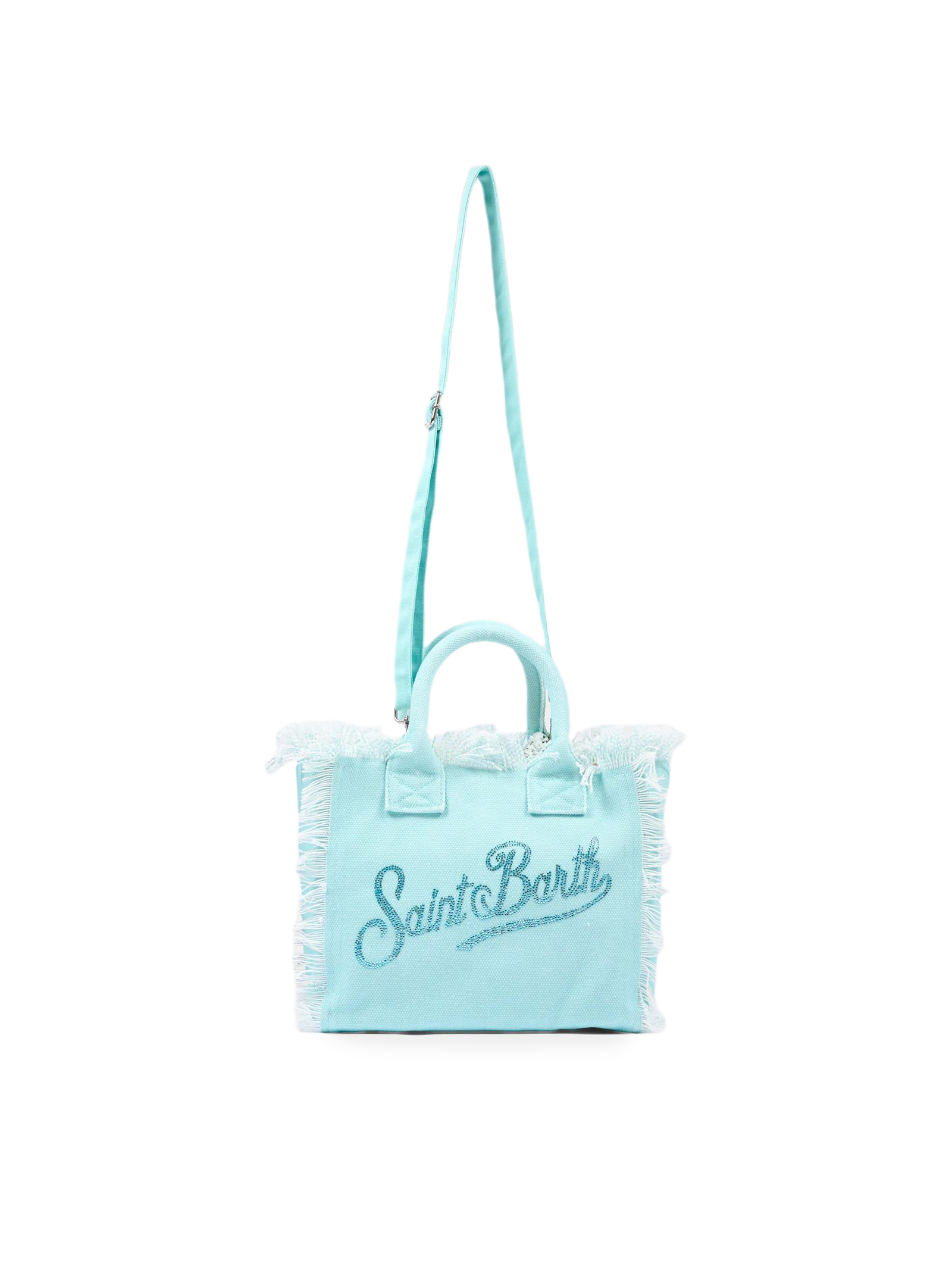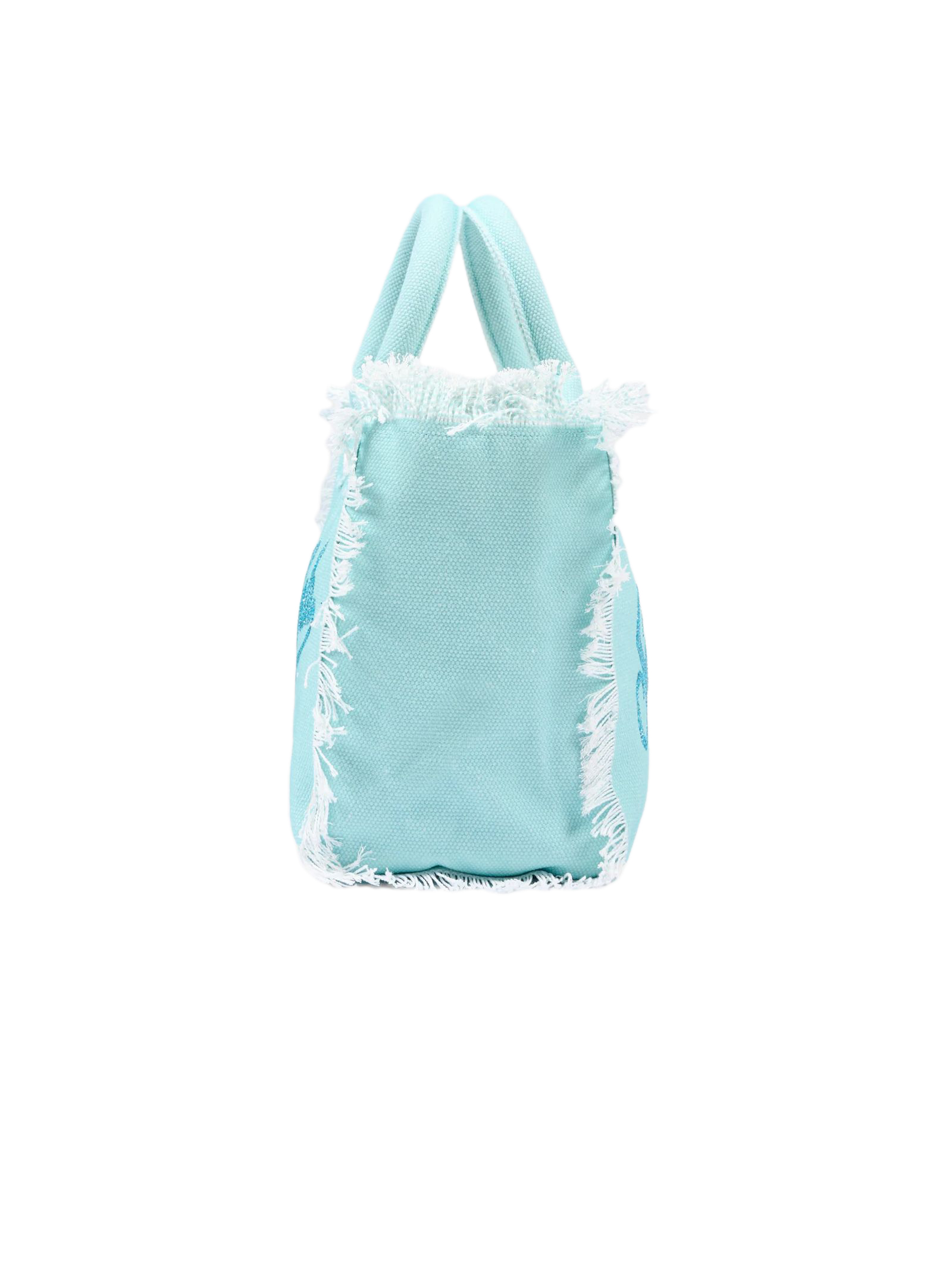 Borsa in canvas di cotone verde acqua, con dettaglio di frange, tasca interna, chiusura con zip, doppi manici tubolari, tracolla regolabile e removibile, maxi logo con strass applicati sul davanti, 26 x 23 x 15 cm