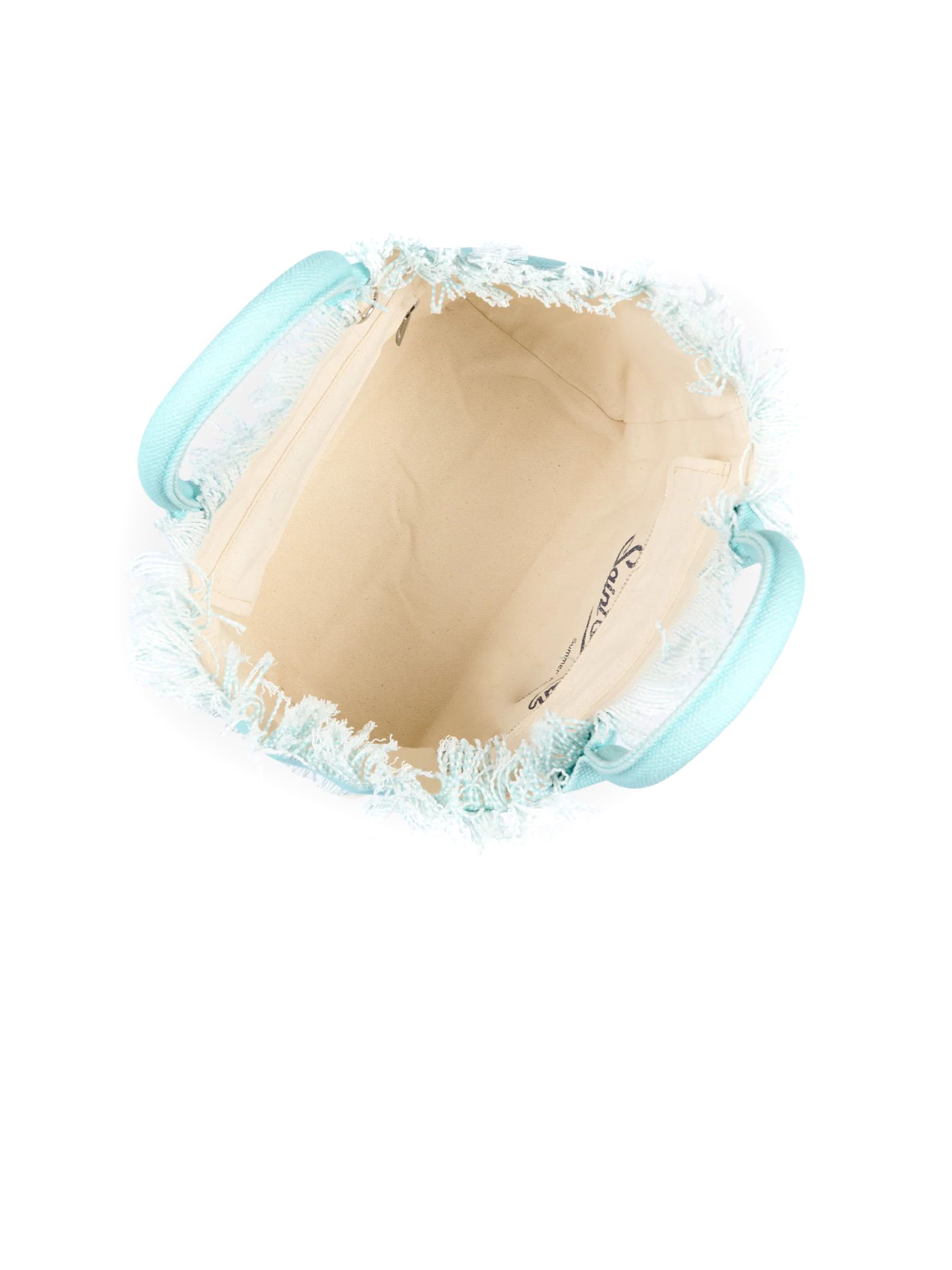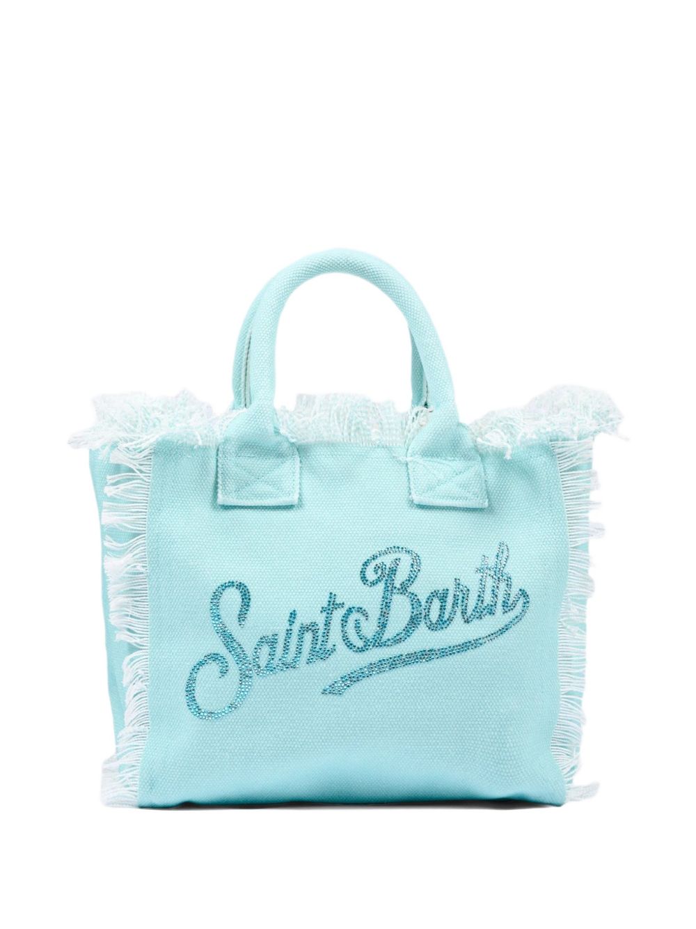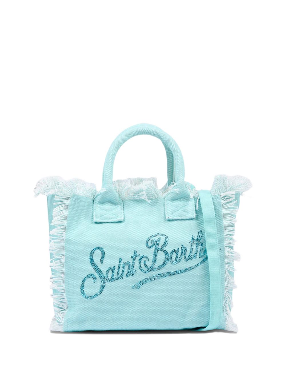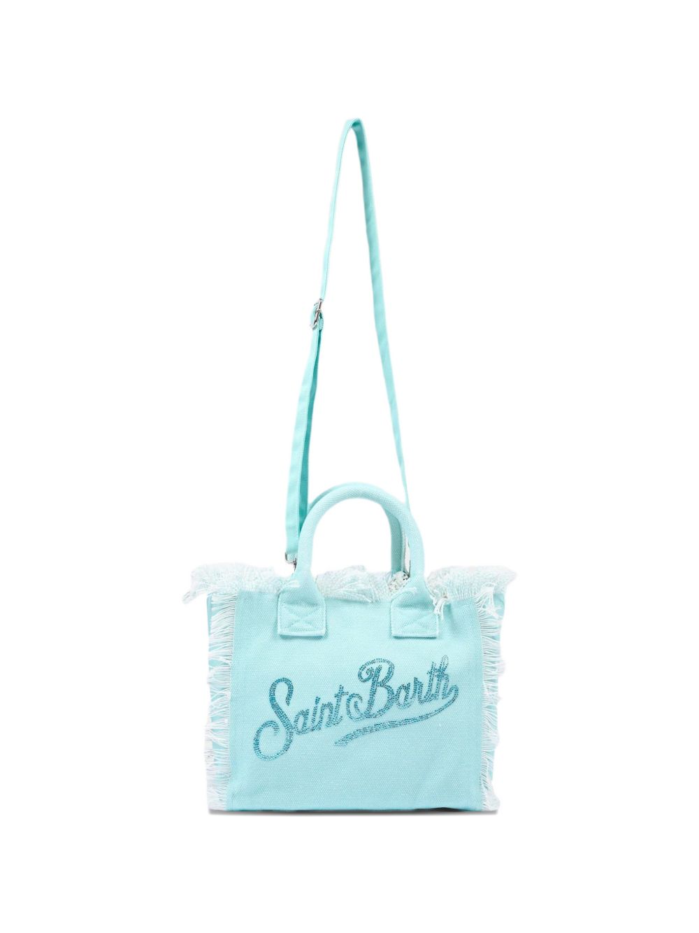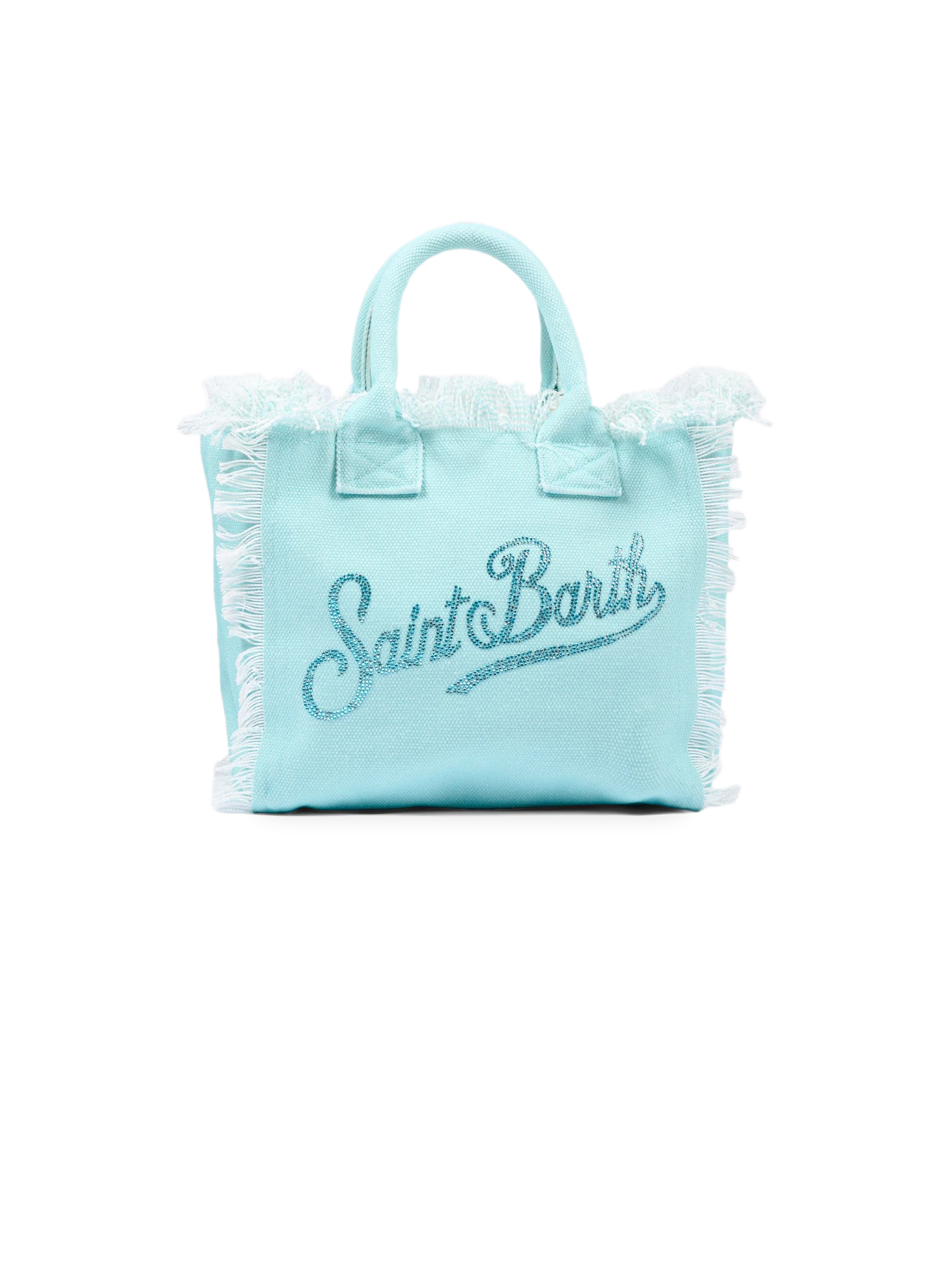 Borsa in canvas di cotone verde acqua, con dettaglio di frange, tasca interna, chiusura con zip, doppi manici tubolari, tracolla regolabile e removibile, maxi logo con strass applicati sul davanti, 26 x 23 x 15 cm