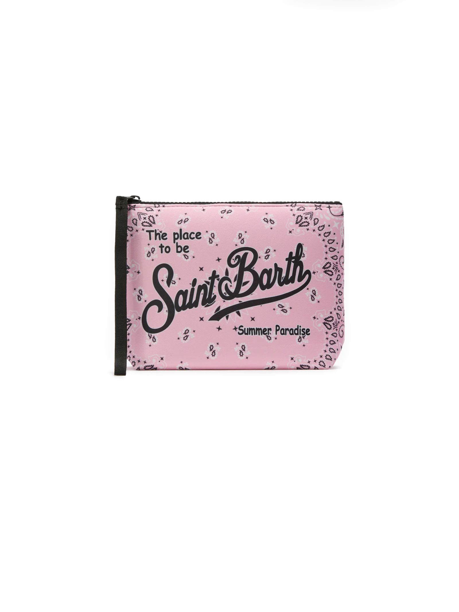 Pochette Aline Tessuto Scuba Rosa, Stampa bandana all-over, Logo stampato a contrasto, Chiusura con zip, Laccetto laterale in gros grain, Dimensioni: 21 X 15,5 X 7 Cm