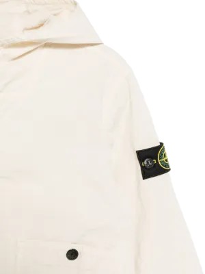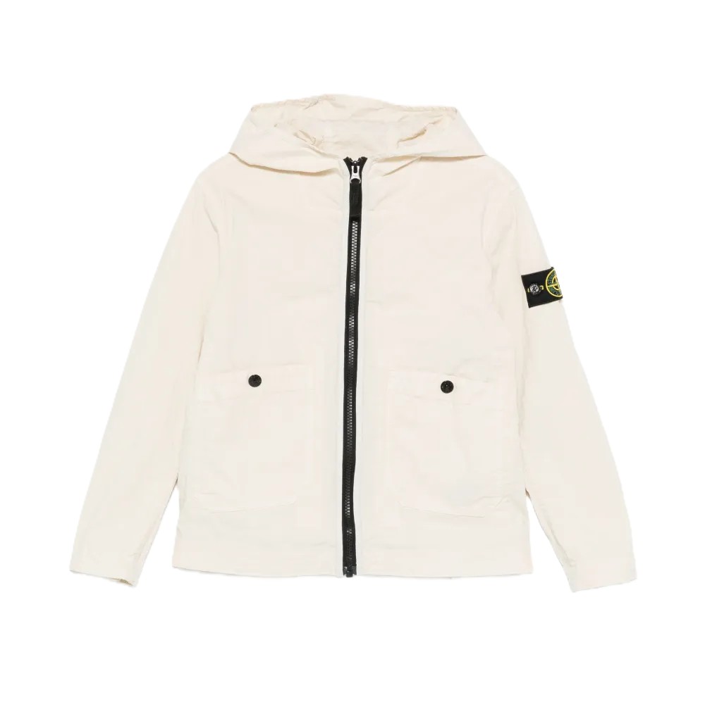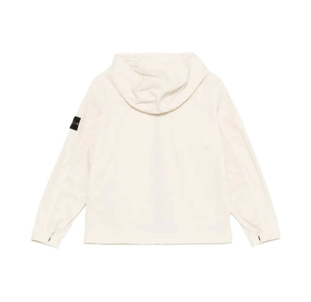 Tessuto ripstop beige, motivo bussola, cappuccio classico, chiusura frontale con zip, due tasche frontali con bottoni a pressione, maniche lunghe, polsini con bottoni a pressione, orlo