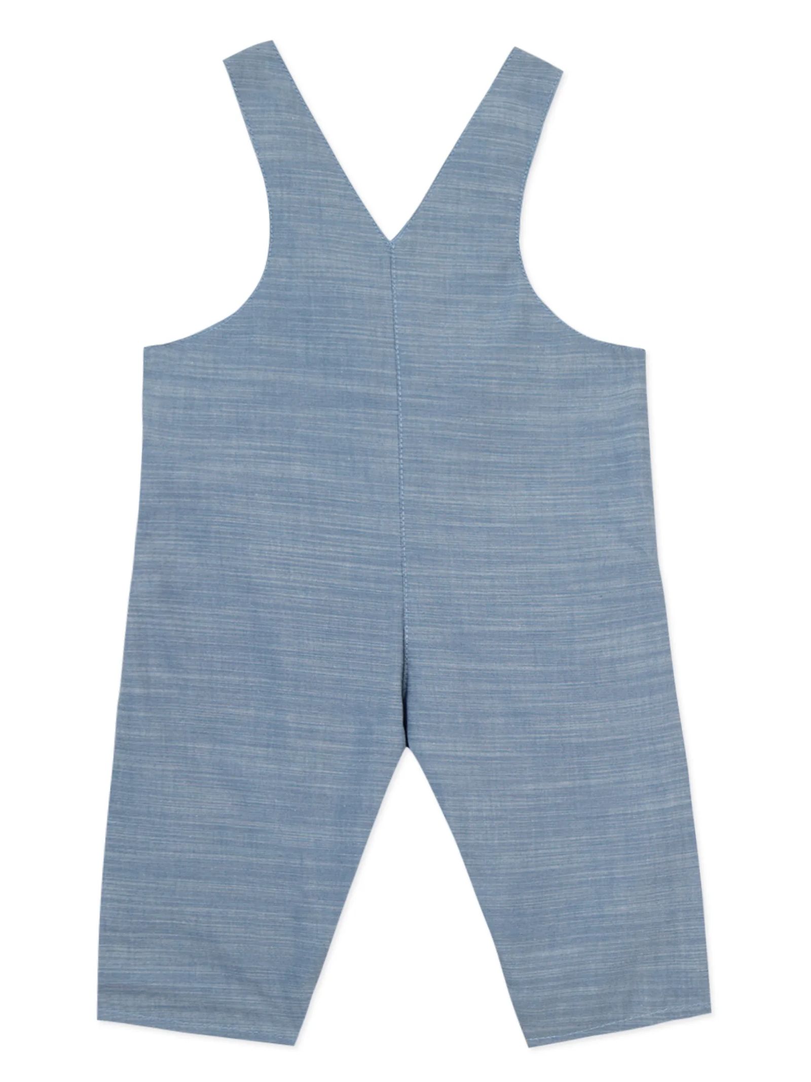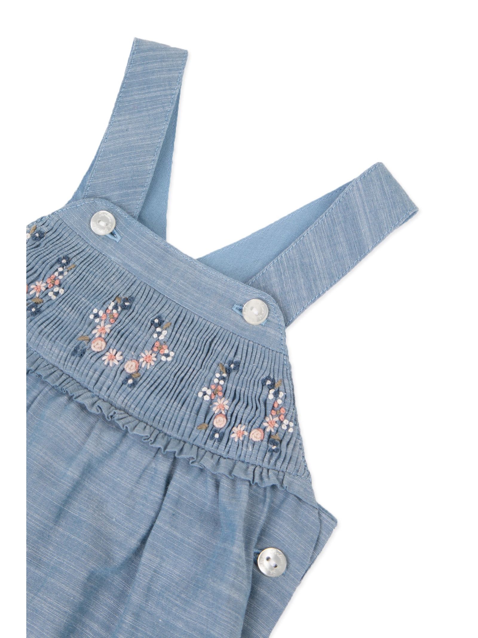 Salopette in denim di cotone blu con ricamo Fleurie, bretelle con chiusura bottone, dettaglio ruches
